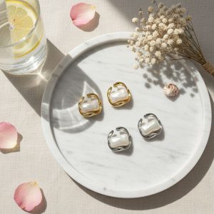 Ατσάλινα Σκουλαρίκια με Μαργαριταρένα Πέτρα – Ασημί