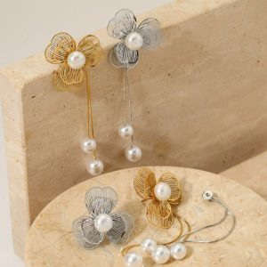 Ατσάλινα Συρμάτινα Σκουλαρίκια Λουλούδι με Κρεμαστές Πέρλες – Ασημί