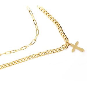 Κολιέ Ατσάλι 304, διπλή αλυσίδα με σταυρό σε χρώμα Χρυσαφί