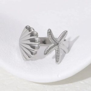 Ατσάλινο Ρυθμιζόμενο Δαχτυλίδι Με Κοχύλι Και Αστερία – Ασημί