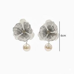 Σκουλαρίκια Ατσάλι Ασημί Λουλούδι με Κρεμαστή Πέρλα και Στρας