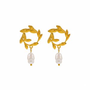 Σκουλαρίκια Ατσάλι με Φύλλα & Μαργαριτάρι