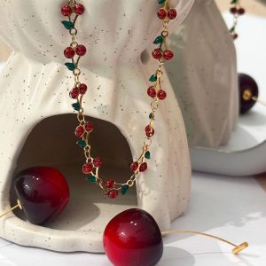 Γοητευτικό ατσάλινο choker κολιέ με σχέδιο από μικρά κεράσια και πράσινα φύλλα, φτιαγμένα με τη μοναδική τεχνική στάλαξης λαδιού για εντυπωσιακή γυαλάδα και ζωντανά χρώματα....