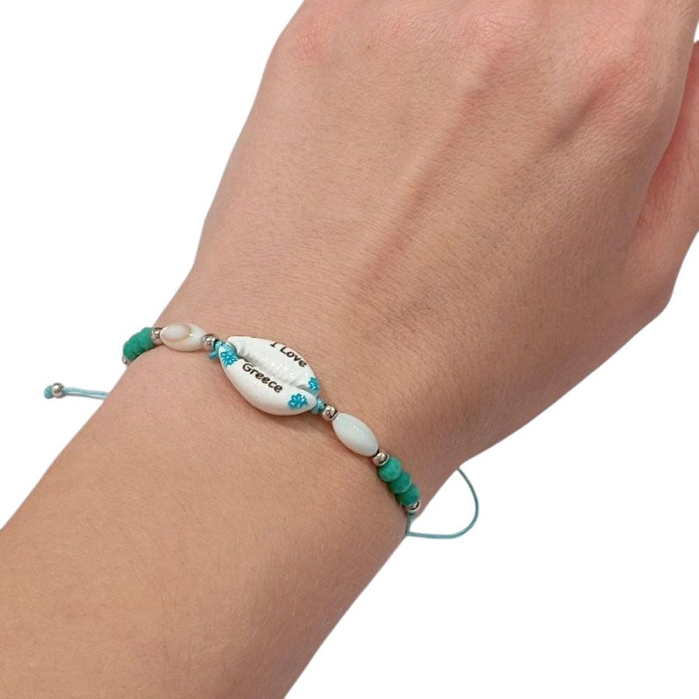 Καλοκαιρινό χειροποίητο βραχιολάκι με φυσικό κοχύλι, διακοσμημένο με χρωματιστές χάντρες και μεταλλικό στοιχείο “I Love Greece”. Ιδανικό ως τουριστικό δώρο ή αναμνηστικό, αποπνέει ελληνική αύρα και στυλ. Διαθέτει ρυθμιζόμενο μέγεθος για άνετη εφαρμογή σε κάθε καρπό.