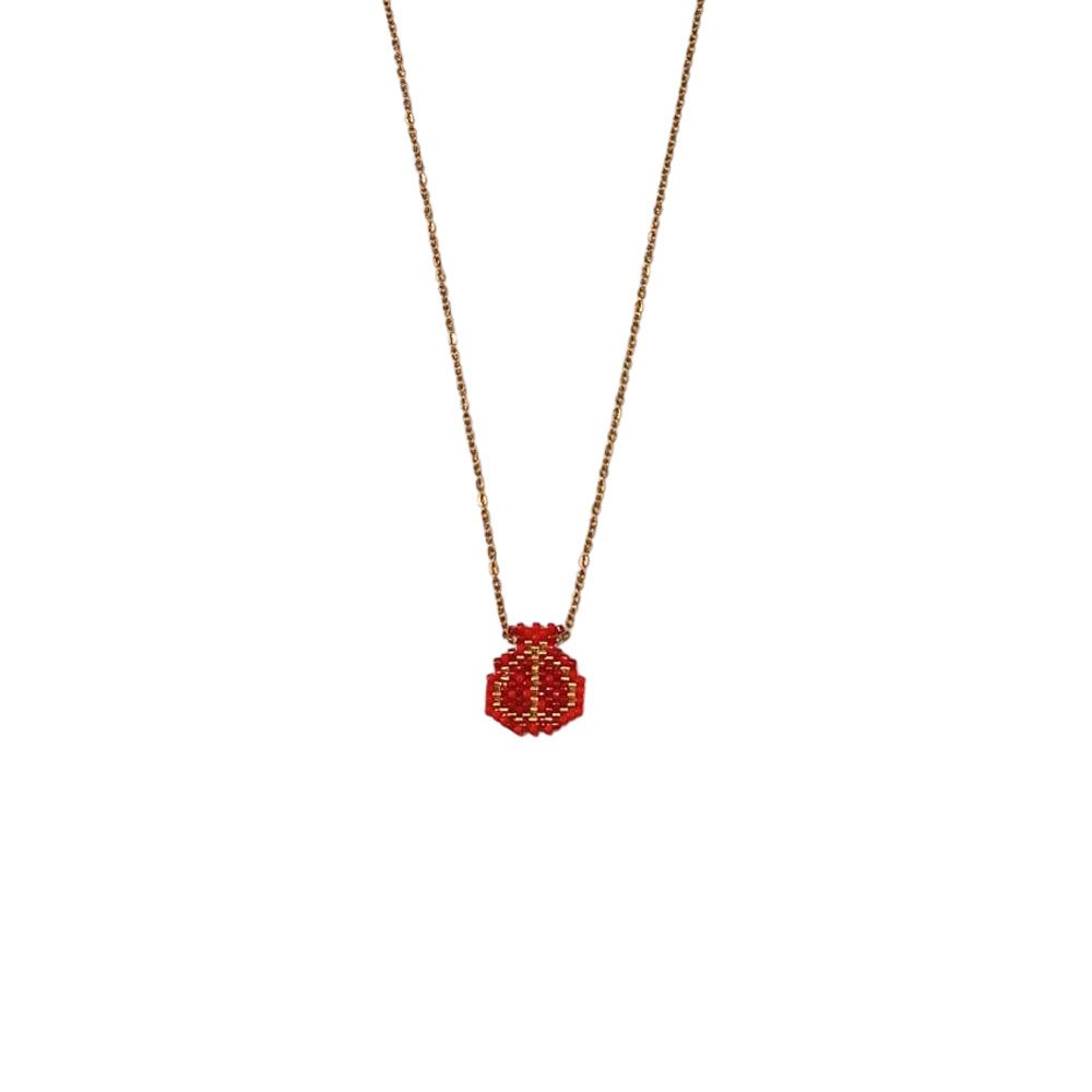 Κομψό κολιέ με μενταγιόν σε σχήμα ροδιού, φτιαγμένο από πολύχρωμες χάντρες Miyuki σε αποχρώσεις του κόκκινου και του χρυσού.Ένα ιδιαίτερο γούρι που συμβολίζει την τύχη, την αφθονία και τη νέα αρχή.Ιδανικό για να χαρίσετε ή να φορέσετε ως διακριτικό φυλαχτό όλο τον χρόνο.