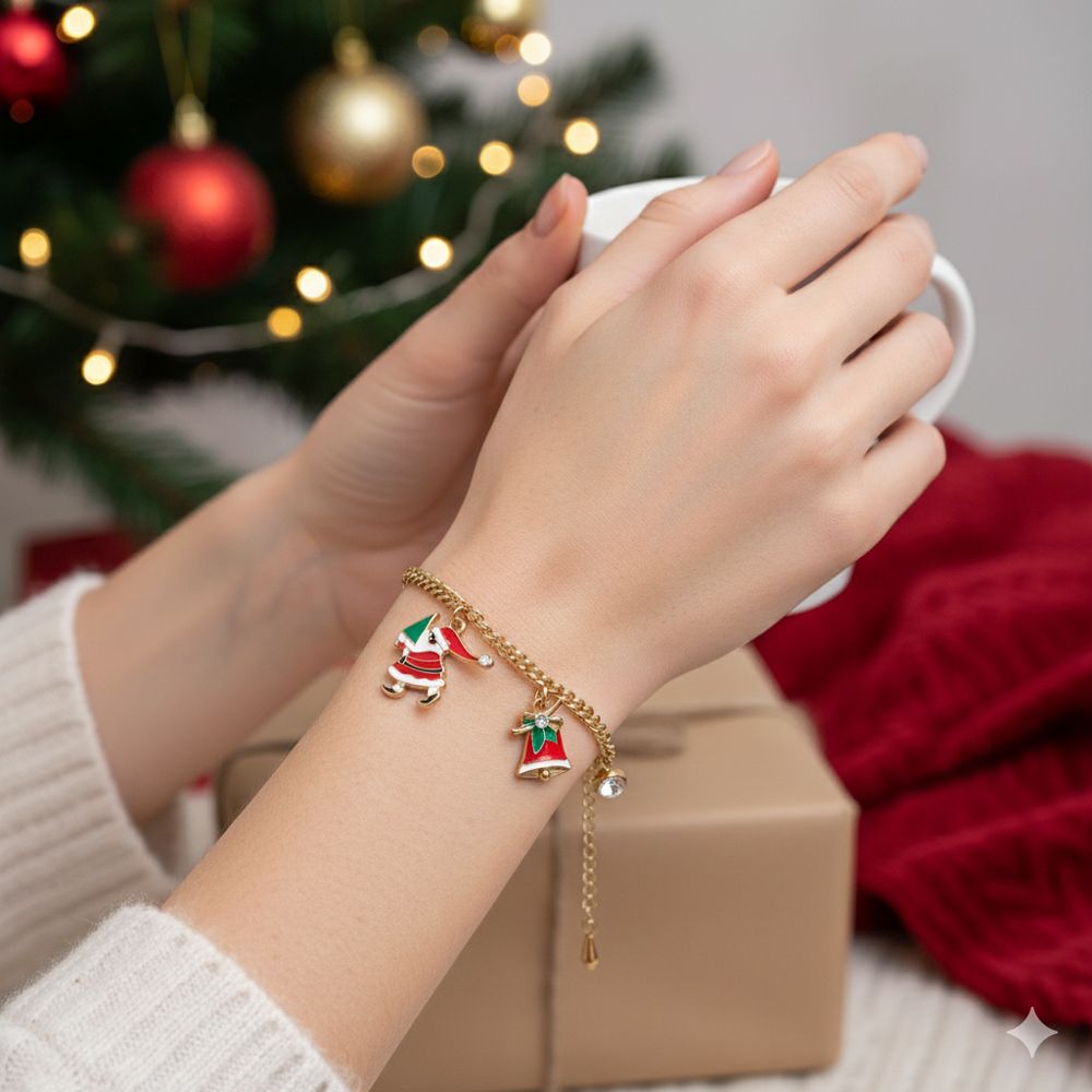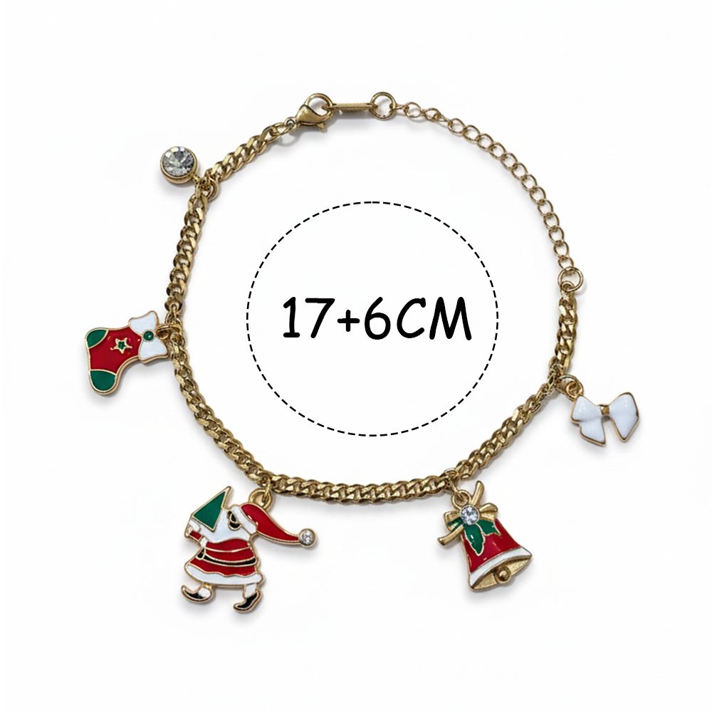 Γιορτινό ατσάλινο βραχιόλι με χαριτωμένα charms – Άγιο Βασίλη, κάλτσα, καμπάνα και φιόγκο. Ένα παιχνιδιάρικο και λαμπερό κόσμημα που αποπνέει τη μαγεία των Χριστουγέννων. Κατασκευασμένο από ανοξείδωτο ατσάλι με πολύχρωμες λεπτομέρειες σμάλτου και χρυσή απόχρωση που προσφέρει κομψότητα και ανθεκτικότητα. Χαρακτηριστικά: Υλικό: Ανοξείδωτο ατσάλι Σχέδιο: Charms Άγιου Βασίλη, κάλτσας, καμπάνας & φιόγκου Χρώμα: Χρυσό με κόκκινες, πράσινες & λευκές λεπτομέρειες Ρυθμιζόμενο μέγεθος Ιδανικό για γιορτινές εμφανίσεις ή ως δώρο