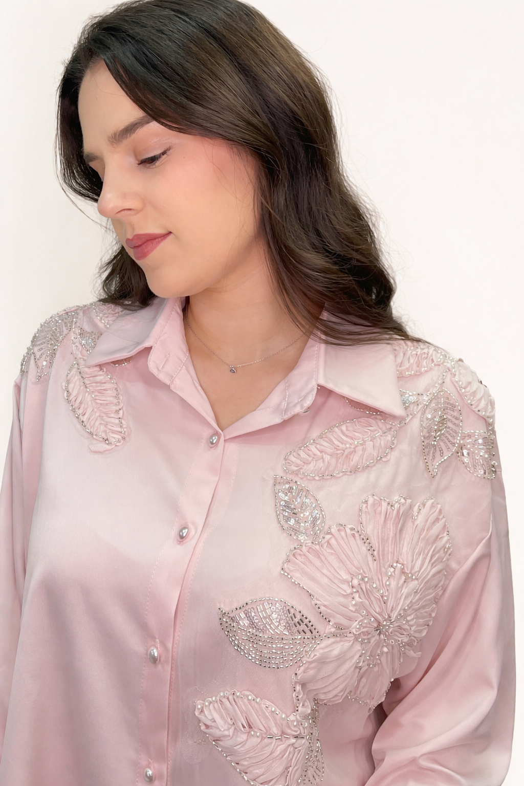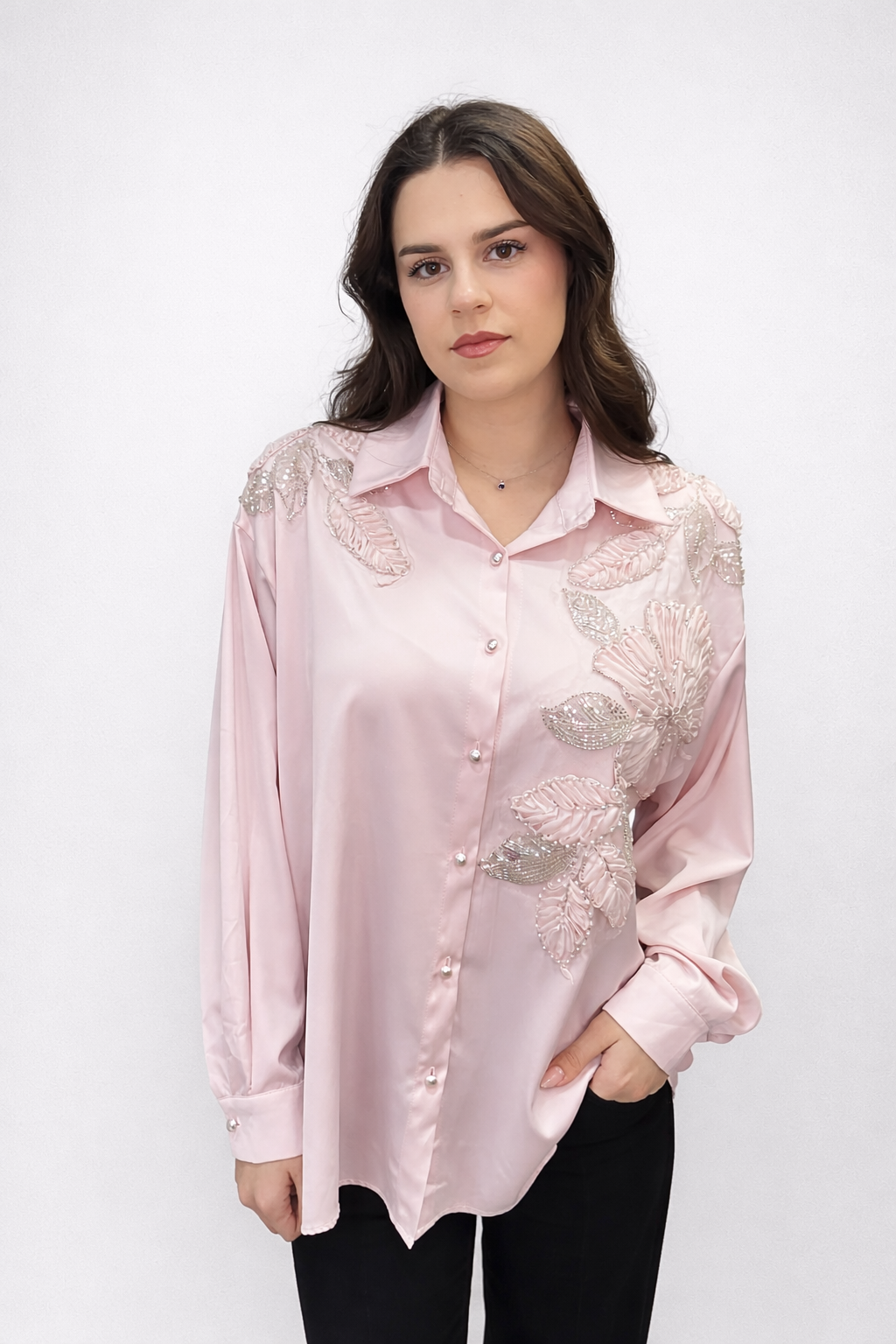 One size ροζ πουκάμισο τύπου σατέν με άνεση εως xl και με ένα πολυ εντυπωσιακό και σικ σχέδιο με πέτρες.