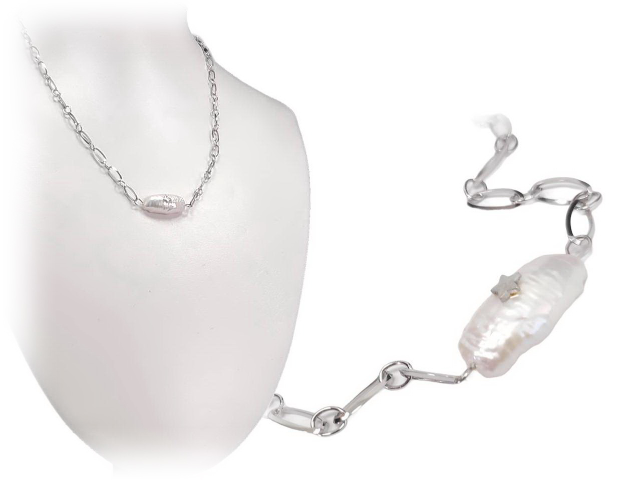 Κολιέ Ατσάλι 316L, αλυσίδα με μαργαριτάρι σε χρώμα Ασημί, Μήκος 40cm
