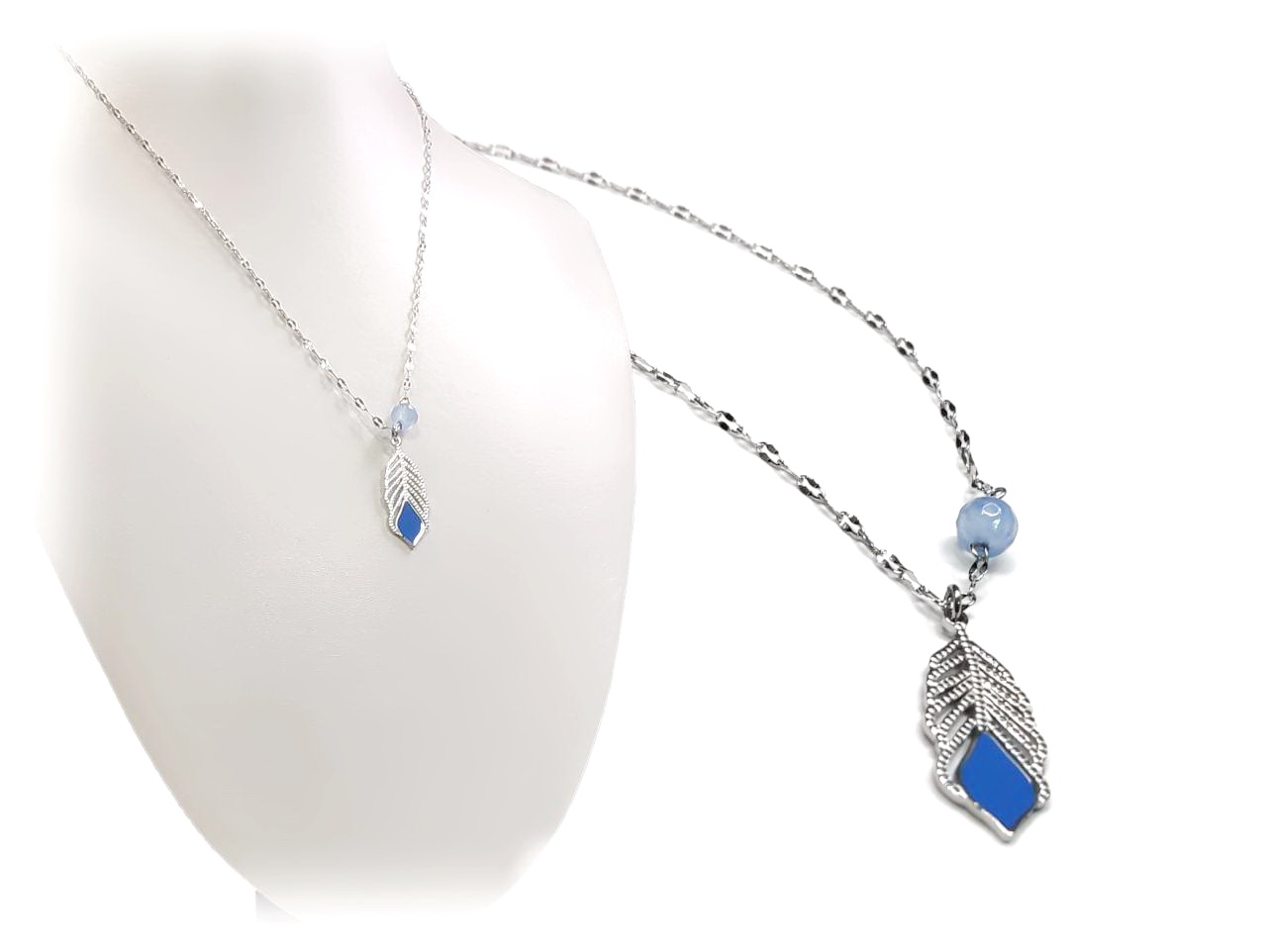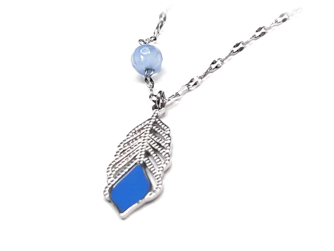 Κολιέ Ατσάλι 316L, αλυσίδα με φτερό και γαλάζια χάντρα σε χρώμα Ασημί, Μήκος 40cm