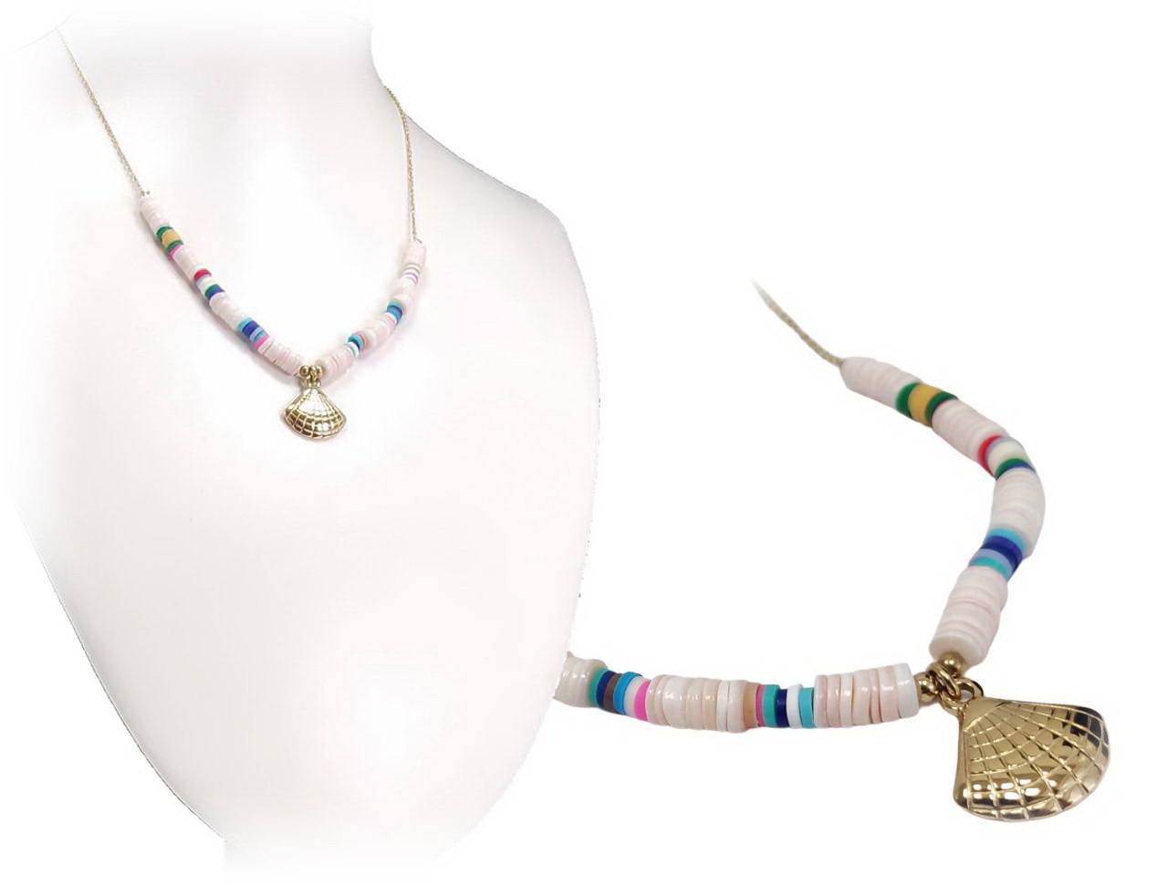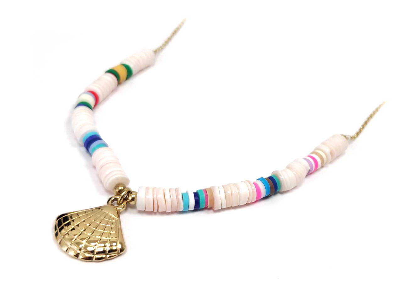 Κολιέ Πέτρα 316L, αλυσίδα και πολύχρωμες χάντρες με κοχύλι σε χρώμα Χρυσαφί, Μήκος 40cm