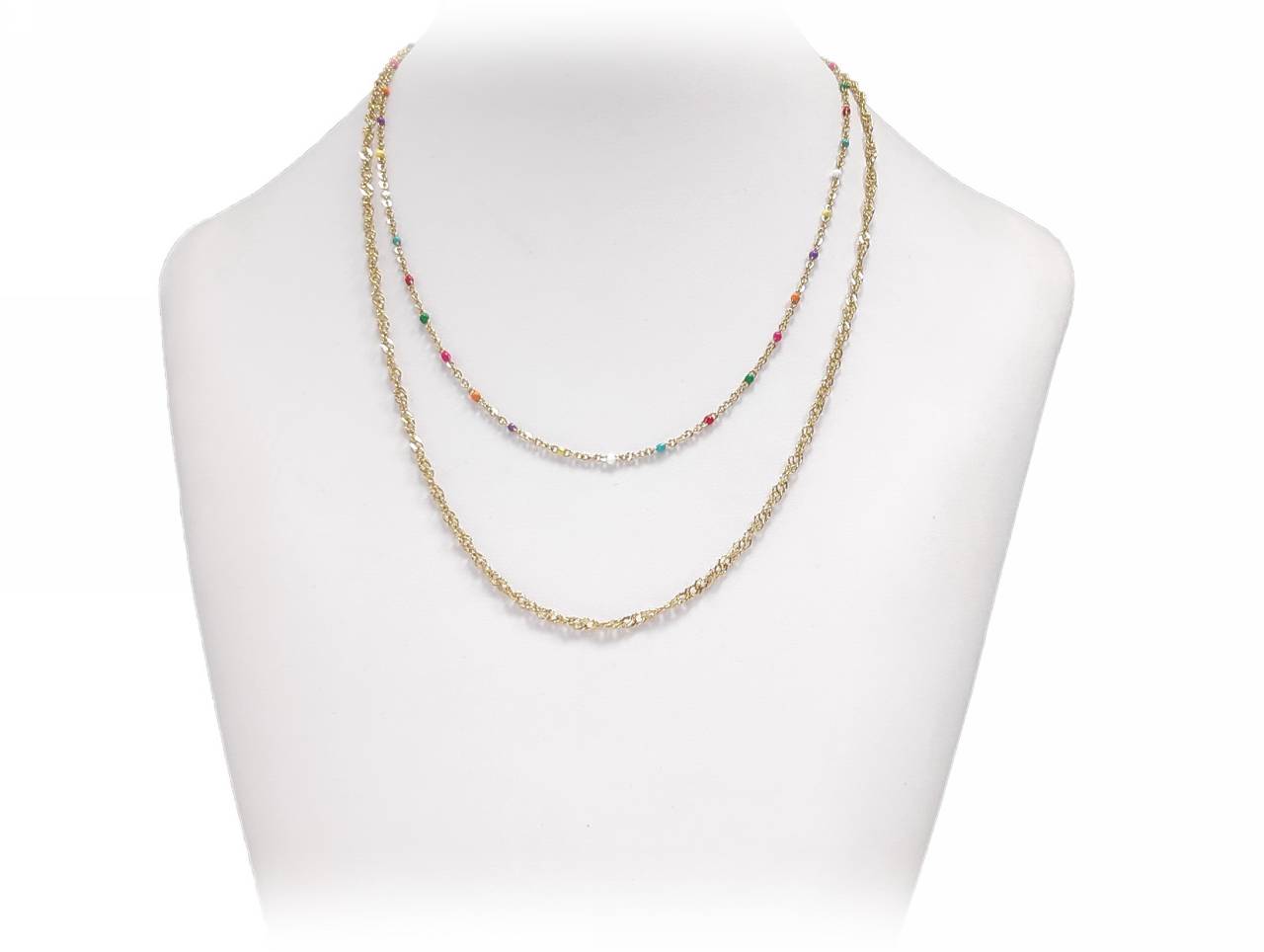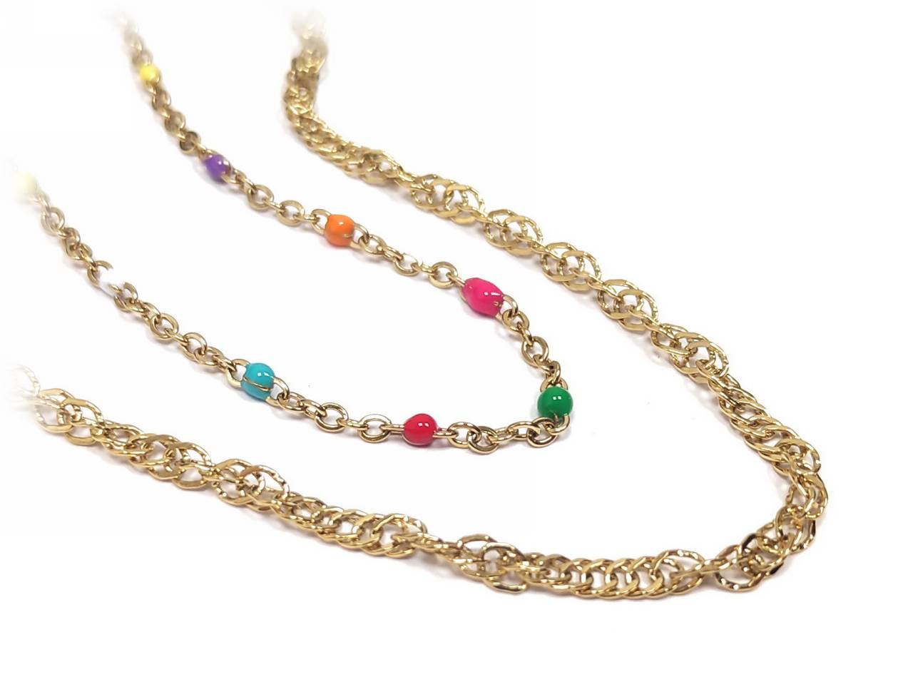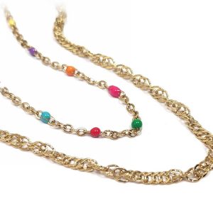 Κολιέ Πέτρα 316L, διπλή αλυσίδα με πολύχρωμες χάντρες σε χρώμα Χρυσαφί