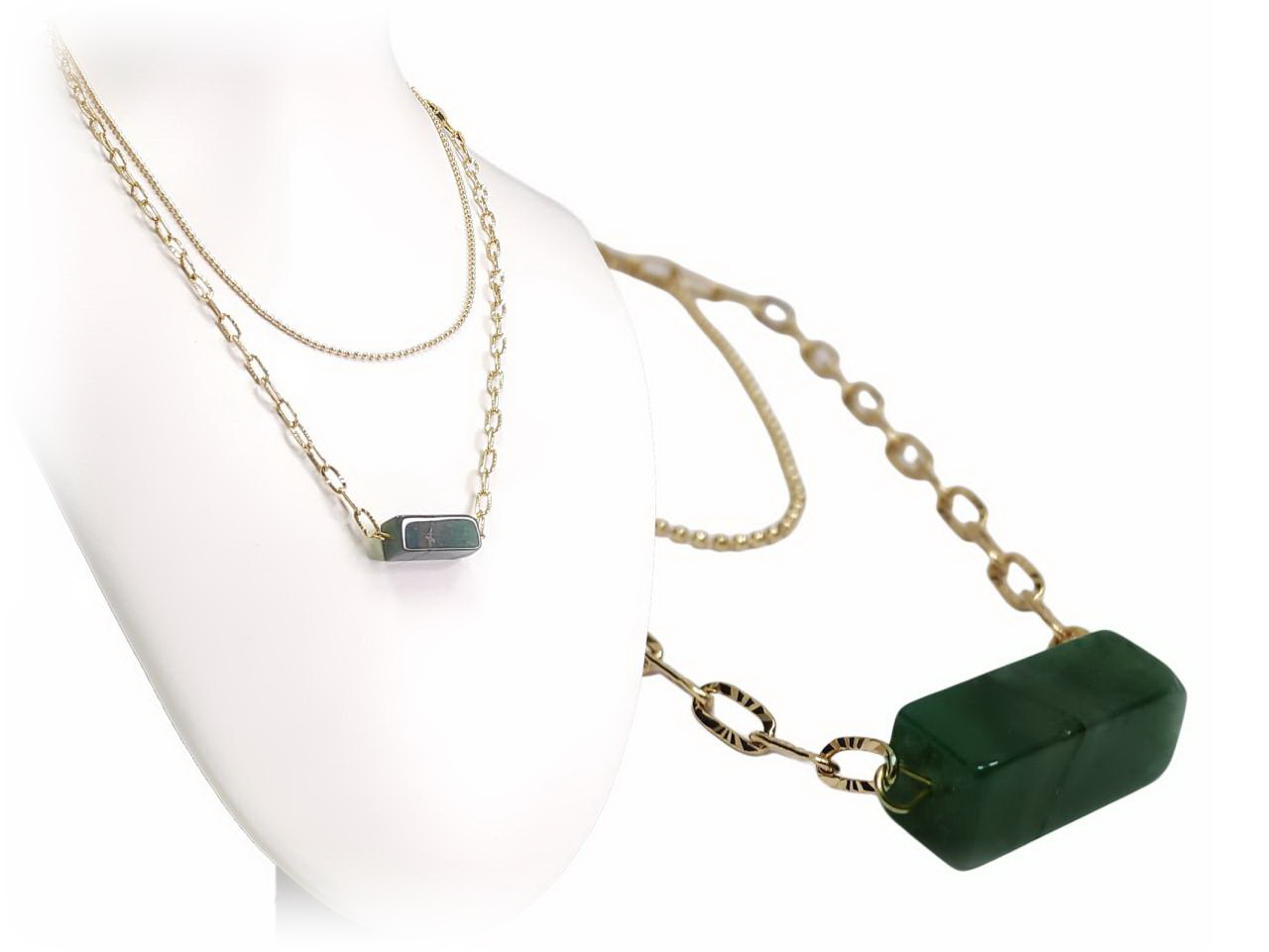 Κολιέ Πέτρα 316L, διπλή αλυσίδα με πράσινο αχάτη σε χρώμα Χρυσαφί