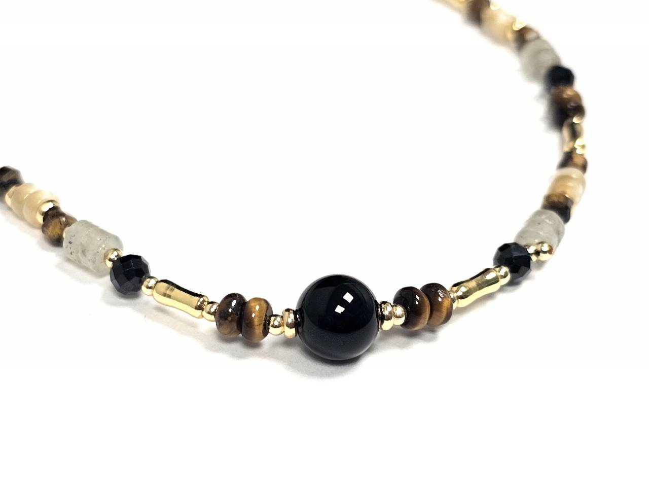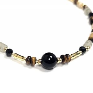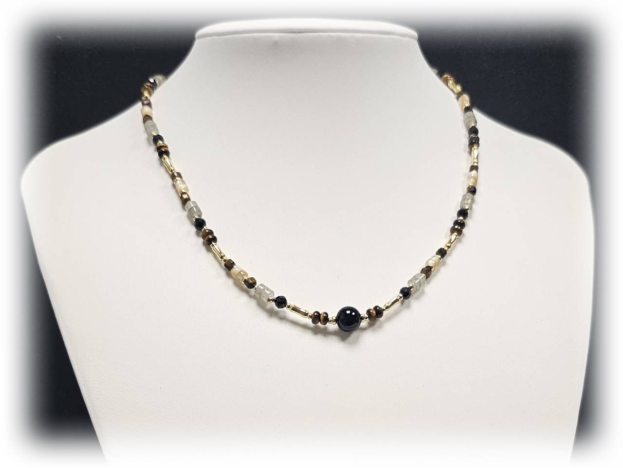 Κολιέ Πέτρα ατσάλι 316L, αλυσίδα με μάτι τίγρης και διάφορες πέτρες σε χρώμα Χρυσαφί