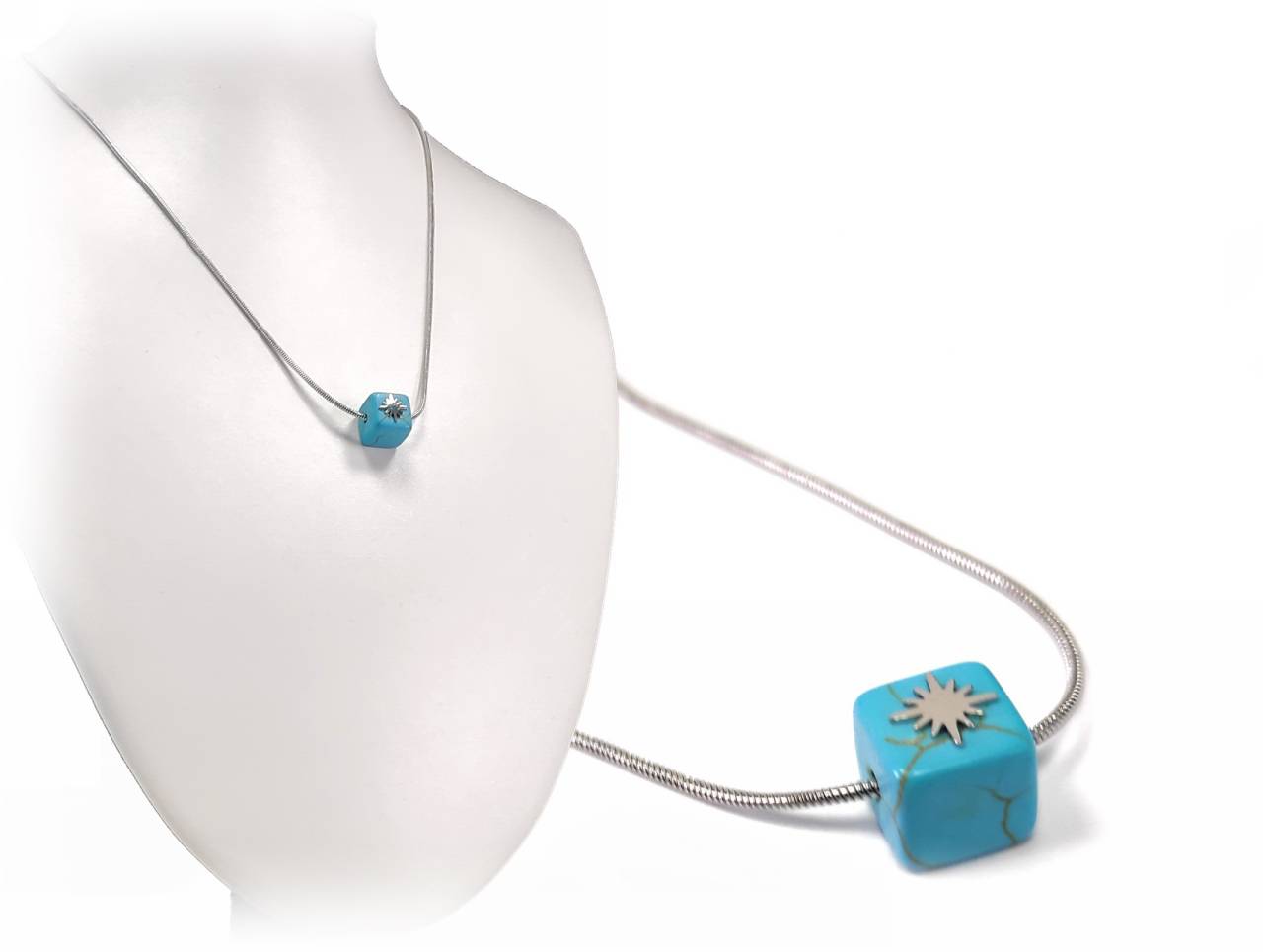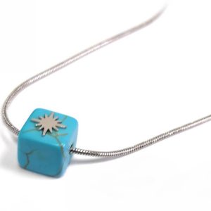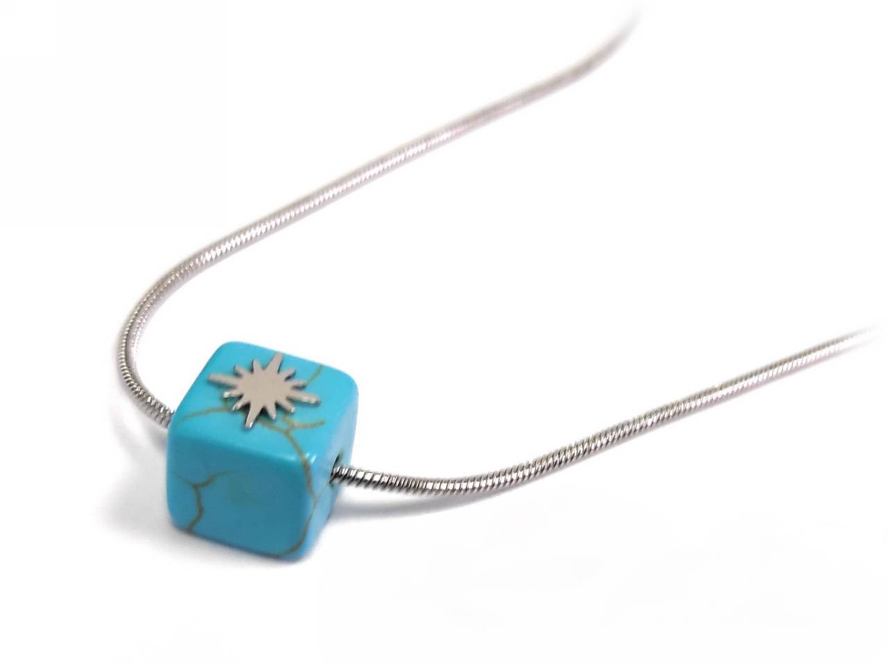Κολιέ Πέτρα 316L, αλυσίδα με τυρκουάζ κύβο σε χρώμα Ασημί, Μήκος 40cm