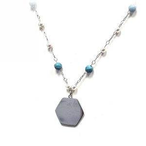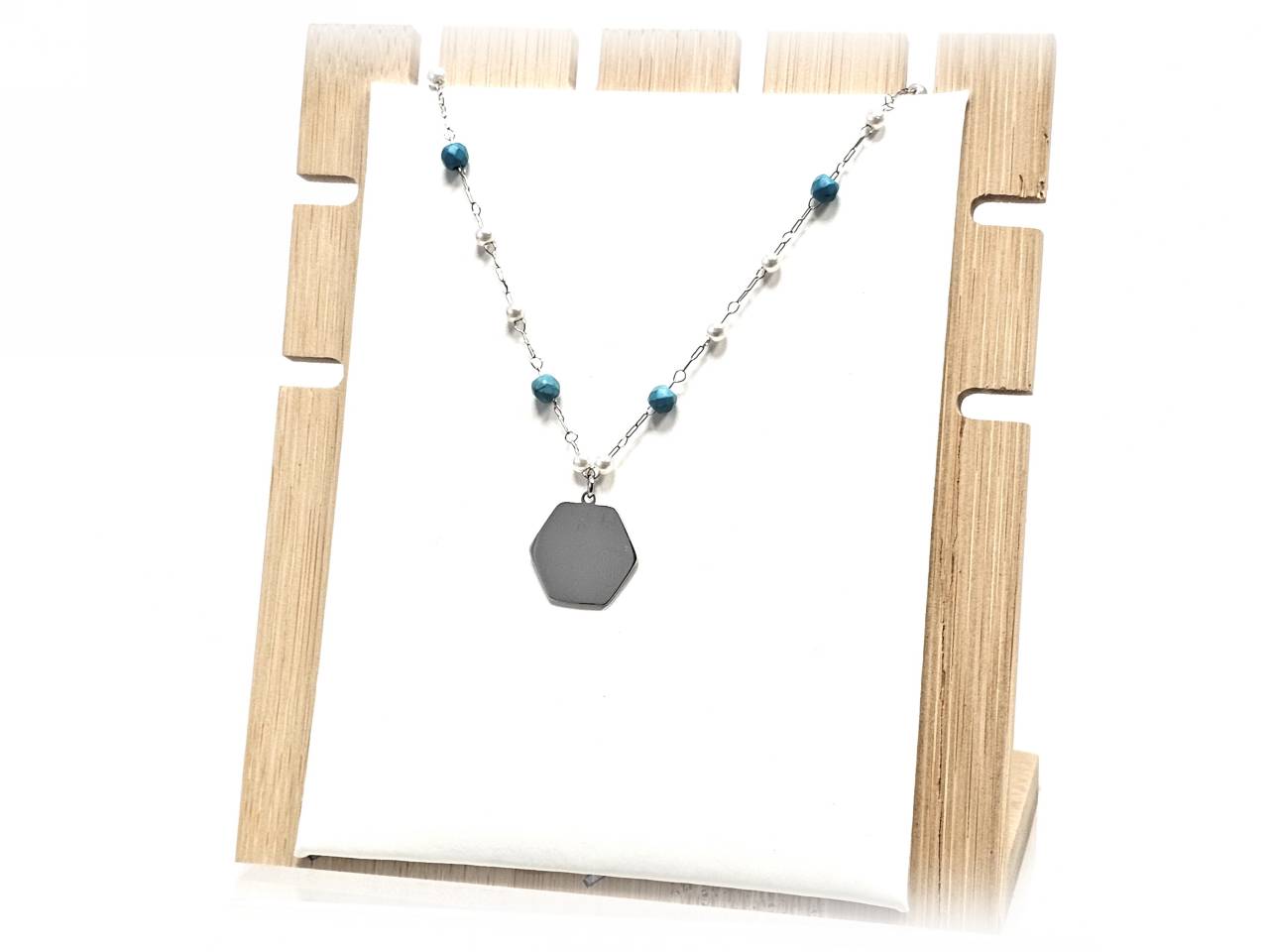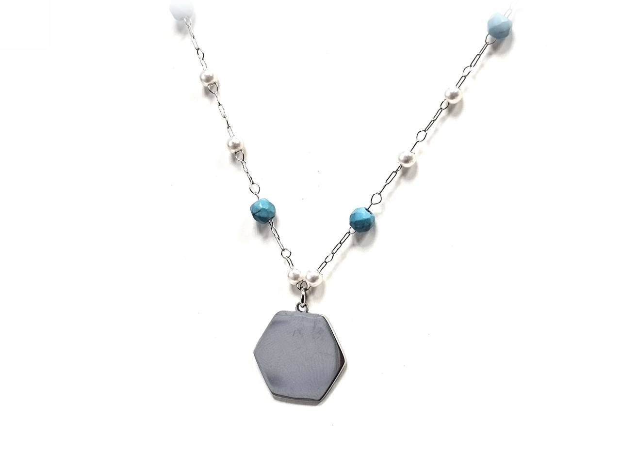 Κολιέ Πέτρα ατσάλι 316L, αλυσίδα με τυρκουάζ και πέρλα σε χρώμα Ασημί