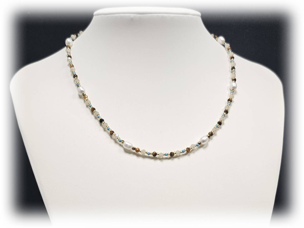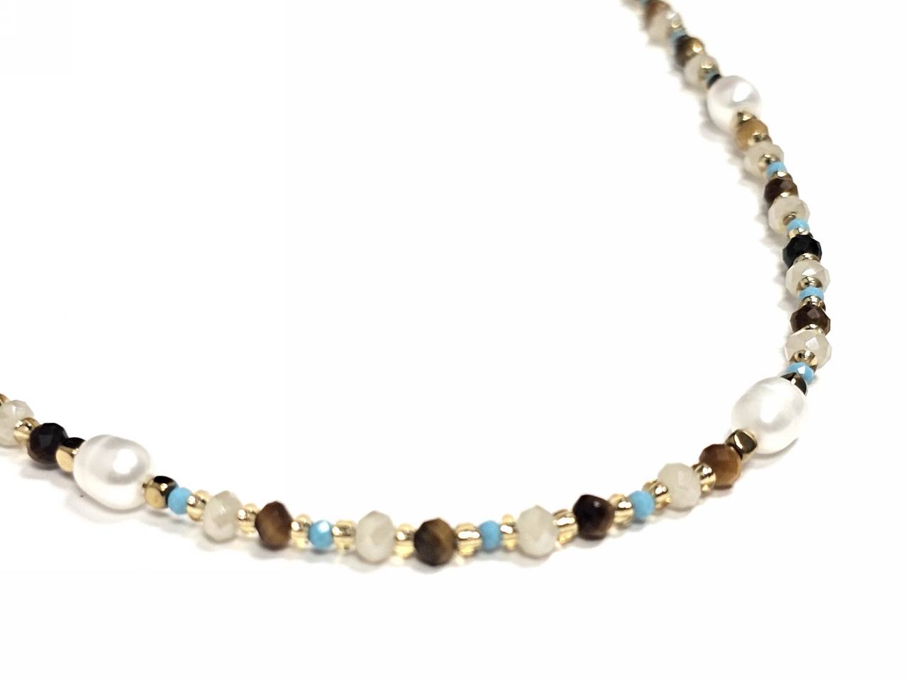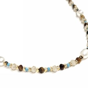 Κολιέ Πέτρα ατσάλι 316L, αλυσίδα με τυρκουάζ, μαργαριτάρι και διάφορες πέτρες σε χρώμα Χρυσαφί