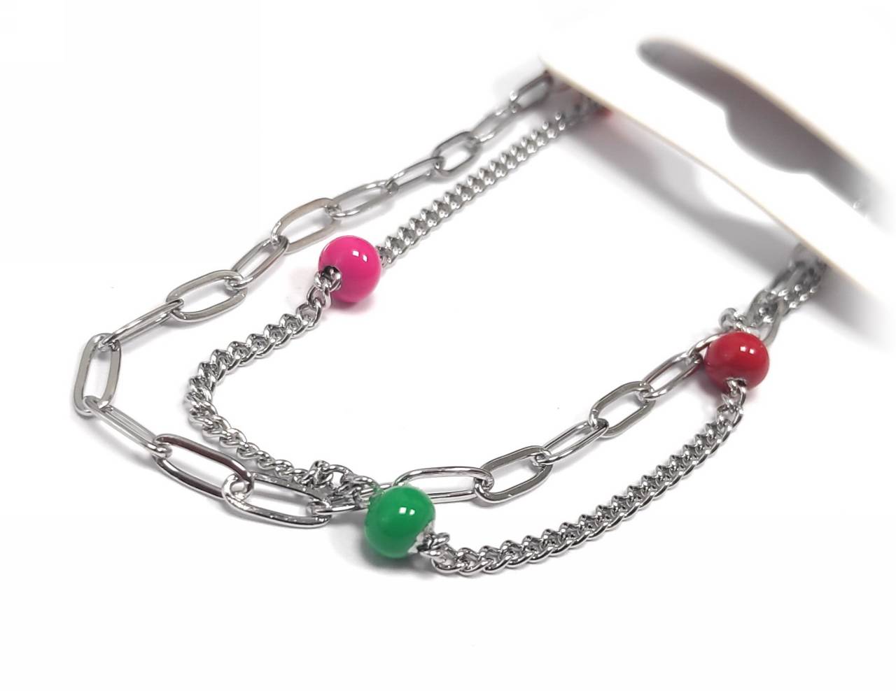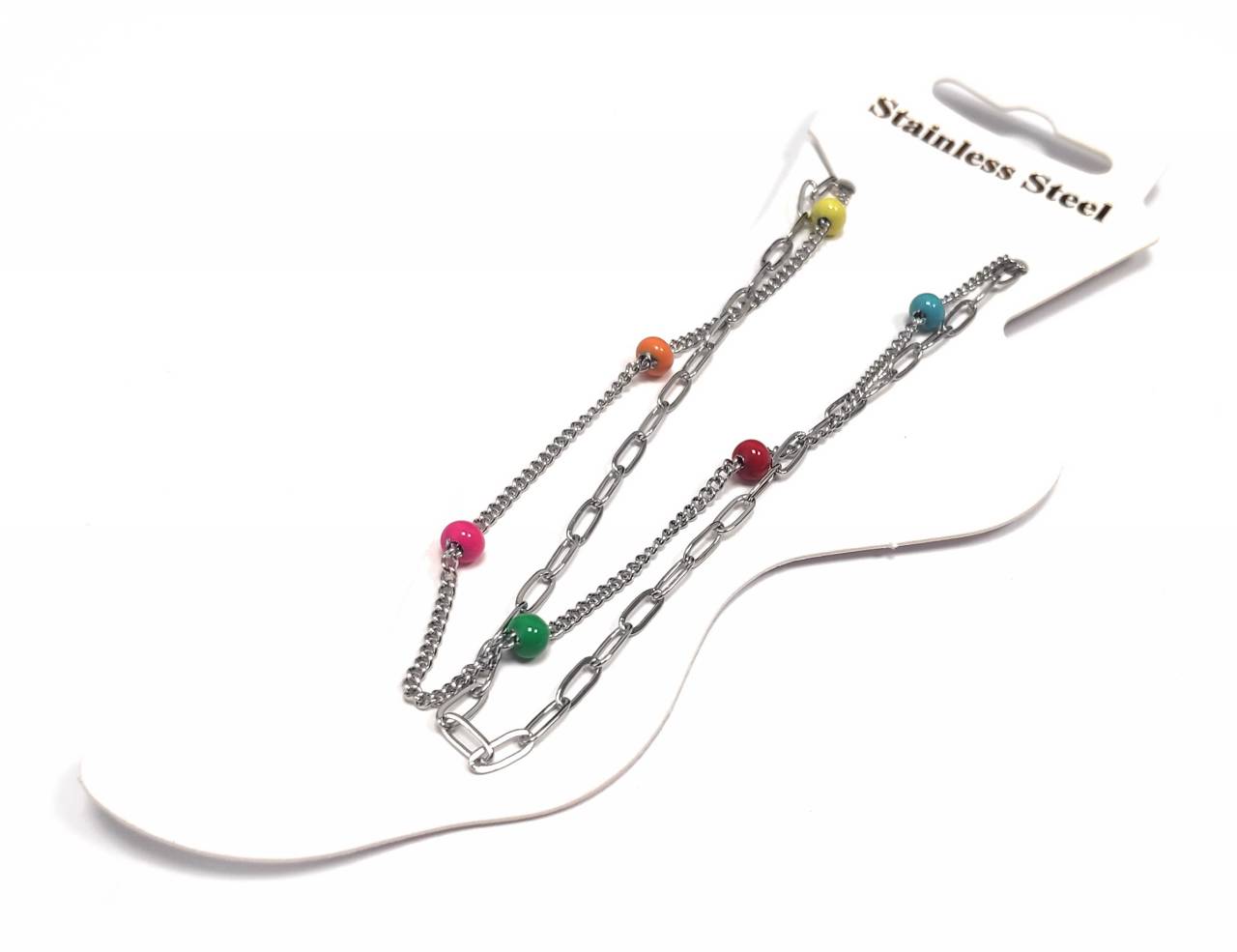 Βραχιόλι Ποδιού Ατσάλι 316L, διπλή αλυσίδα με πολύχρωμες χάντρες σε χρώμα Ασημί