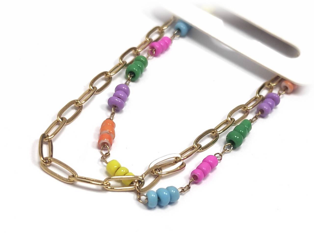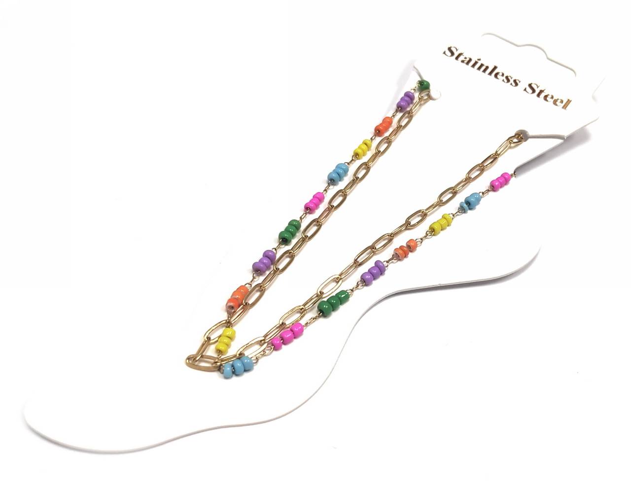 Βραχιόλι Ποδιού Ατσάλι 316L, διπλή αλυσίδα με πολύχρωμες χάντρες σε χρώμα Χρυσαφί