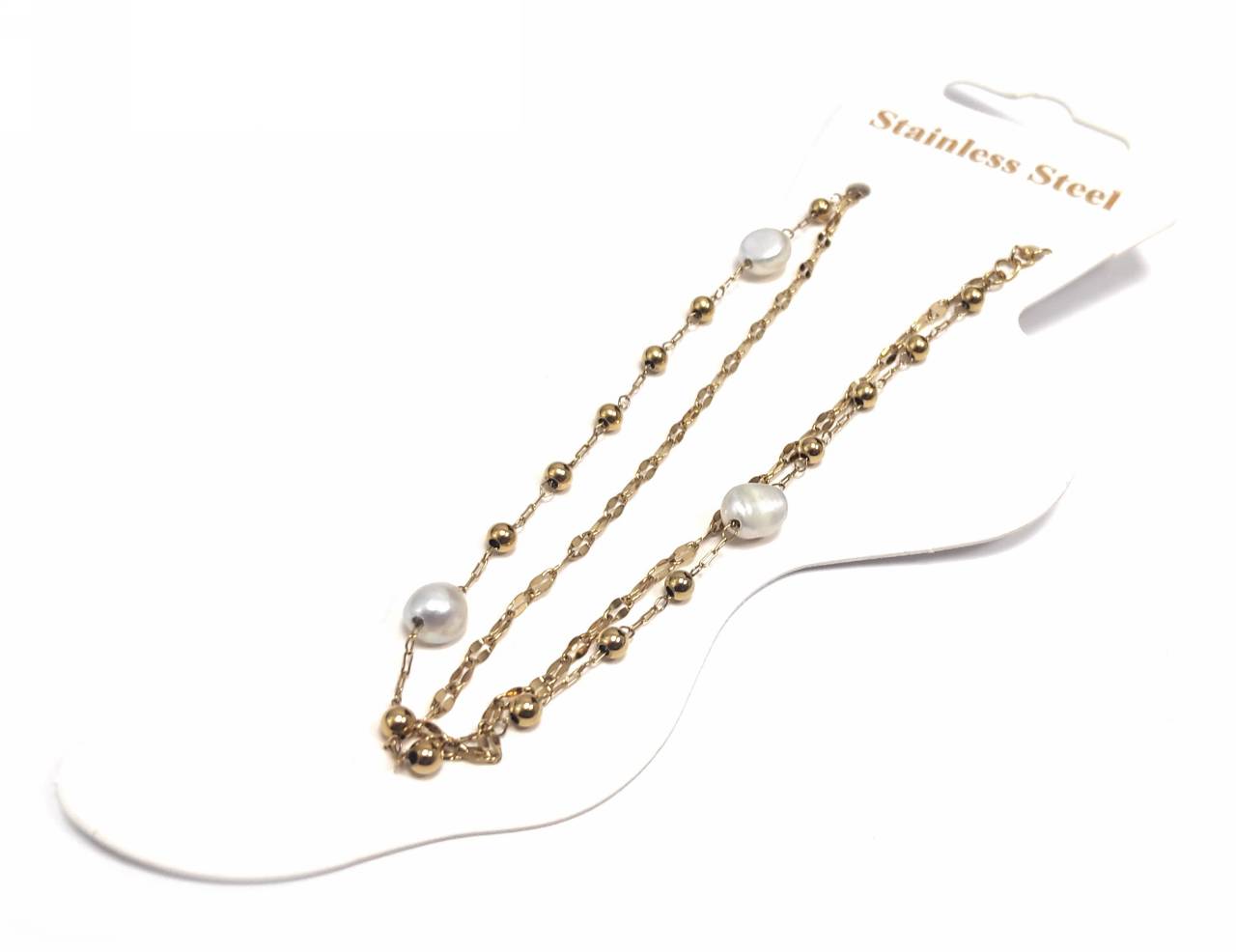 Βραχιόλι Ποδιού Ατσάλι 316L, διπλη αλυσίδα με μαργαριτάρια σε χρώμα Χρυσαφί