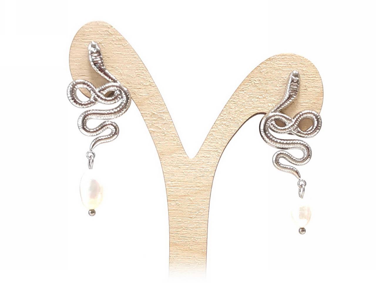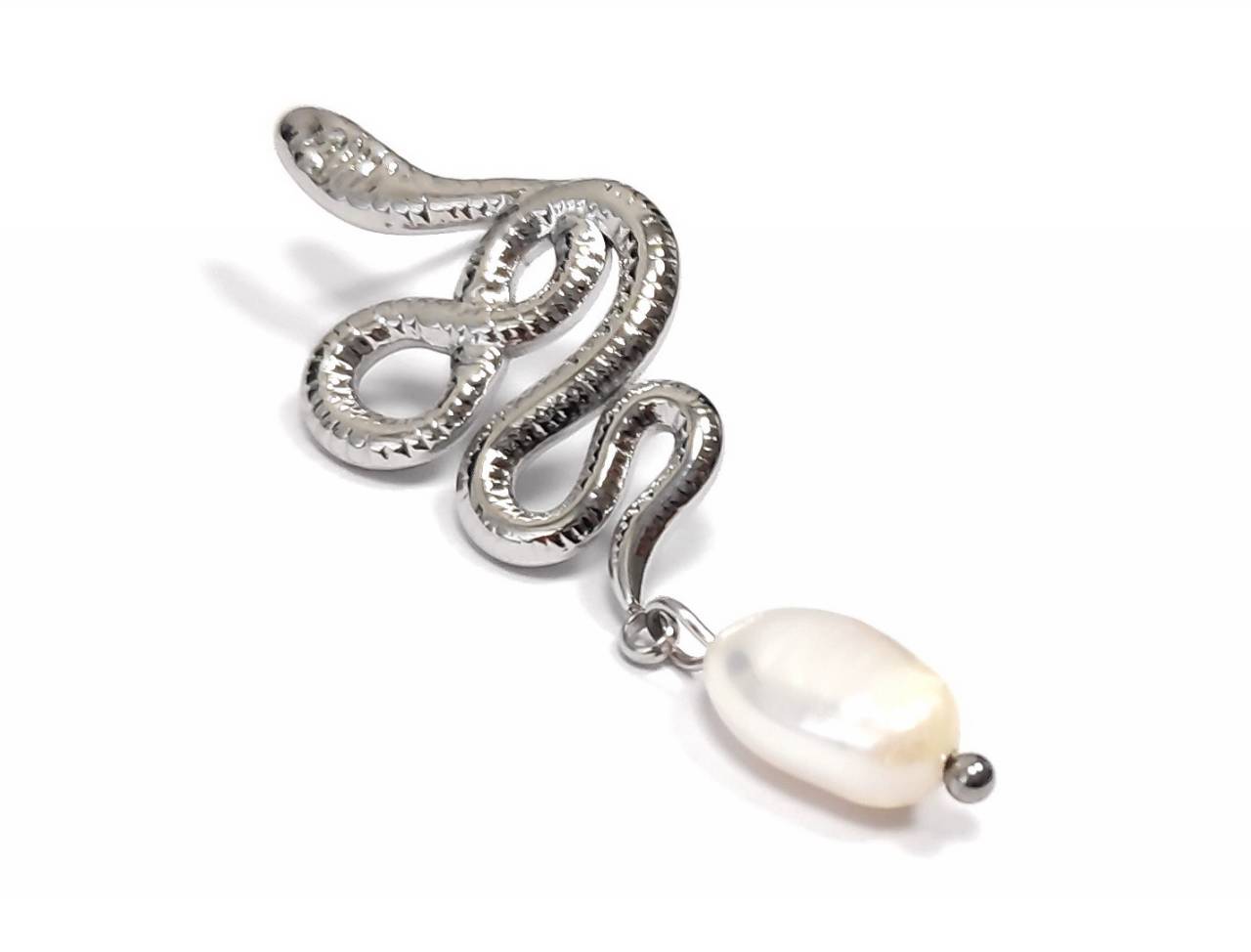 Σκουλαρίκια Ατσάλι 316L, φίδι με μαργαριτάρι σε χρώμα Ασημί