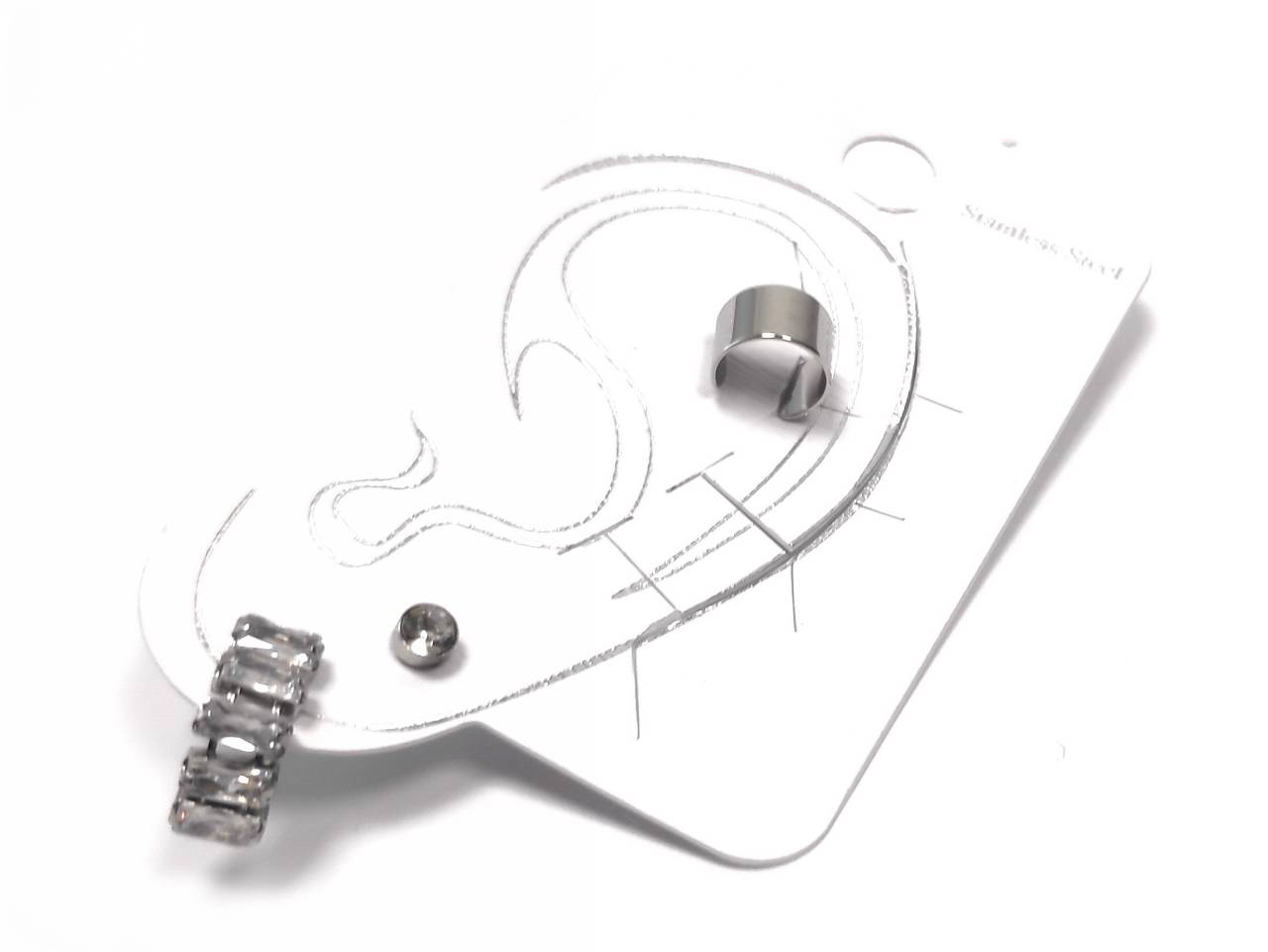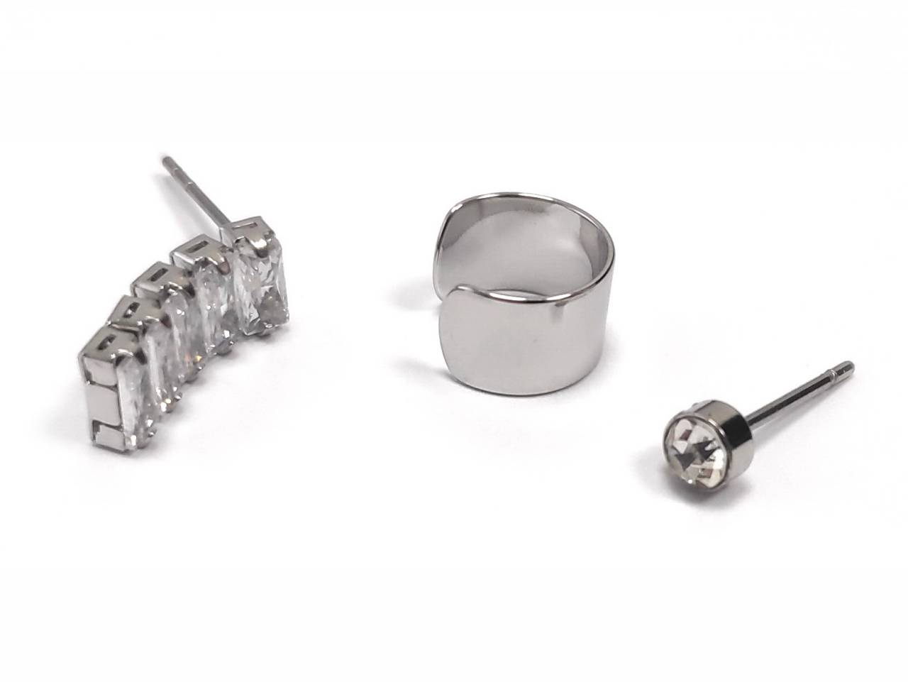 Σκουλαρίκια Ατσάλι 316L, 3 τεμάχια (κρίκος Cuff, κρυσταλλάκι και στρας) σε χρώμα Ασημί