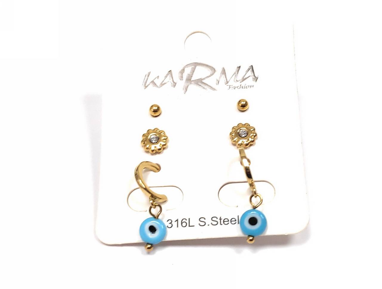 Σκουλαρίκια Ατσάλι 316L, 3 ζευγάρια (κρίκος μάτι, λουλούδι και μπίλια) σε χρώμα Χρυσαφί