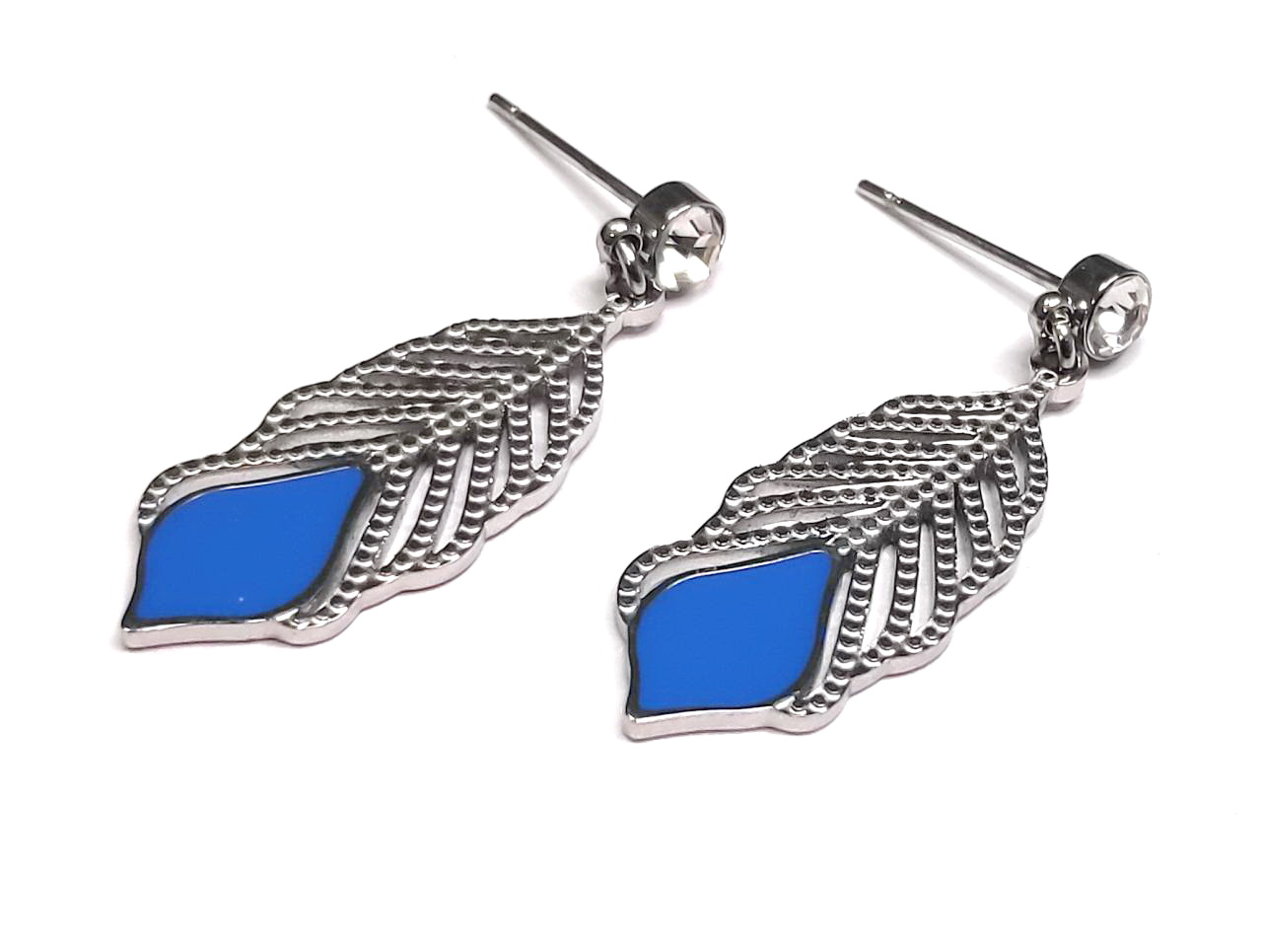 Σκουλαρίκια Ατσάλι 316L φτερό με σμάλτο σε μπλε και στρας σε χρώμα Ασημί