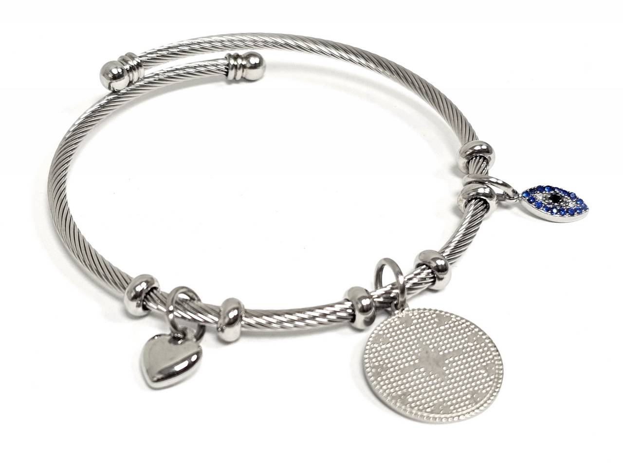 Βραχιόλι Ατσάλι 316L, με καρδιά , μάτι και στρας σε χρώμα Ασημί