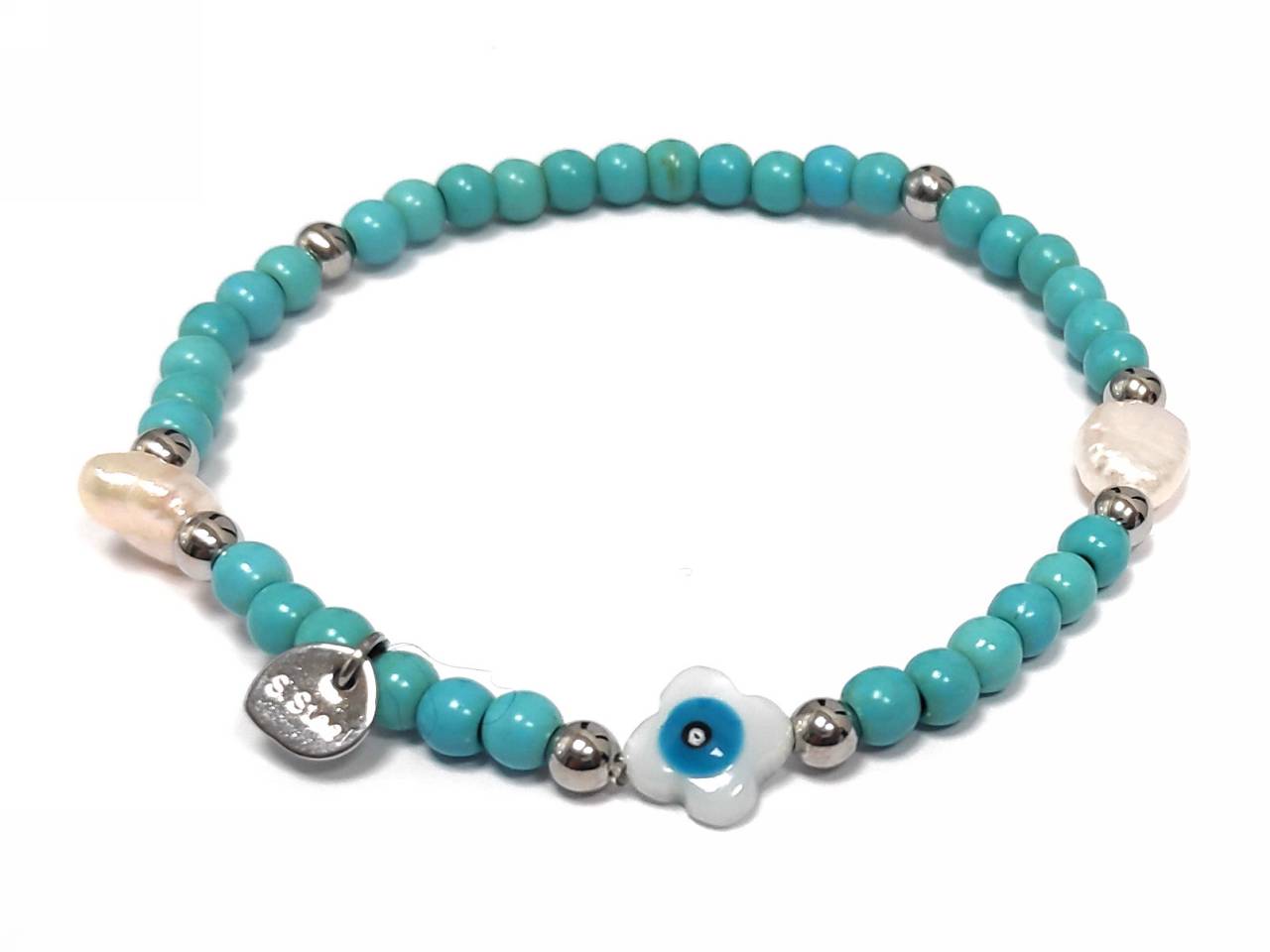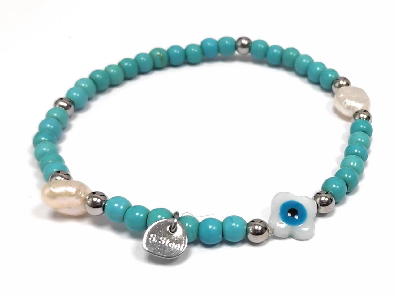 Βραχιόλι Ατσάλι 316L, με τυρκουάζ και μάτι σε χρώμα Ασημί