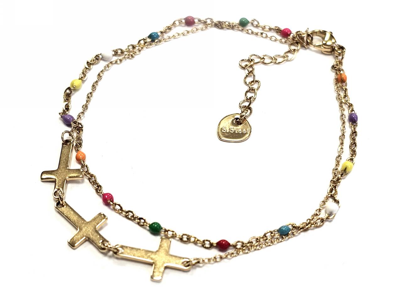 Βραχιόλι Πέτρα ατσάλι 316L, διπλή αλυσίδα με διάφορες πέτρες και σταυρό σε χρώμα Χρυσαφί