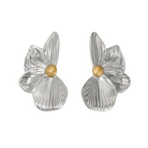 Ατσάλινα Σκουλαρίκια Λουλούδι με Ανάγλυφη Υφή Δίχρωμο