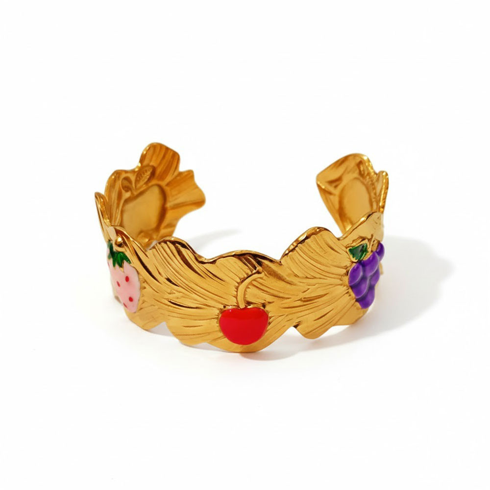 Ατσάλινο χειροπέδα βραχιόλι με ανάγλυφη υφή και παιχνιδιάρικες λεπτομέρειες φρούτων σε χρωματιστό σμάλτο. Ανοιχτό σχέδιο για εύκολη εφαρμογή, που ξεχωρίζει για το ιδιαίτερο design και τον μοναδικό χαρακτήρα του. Ιδανικό για statement εμφανίσεις με καλοκαιρινή διάθεση.