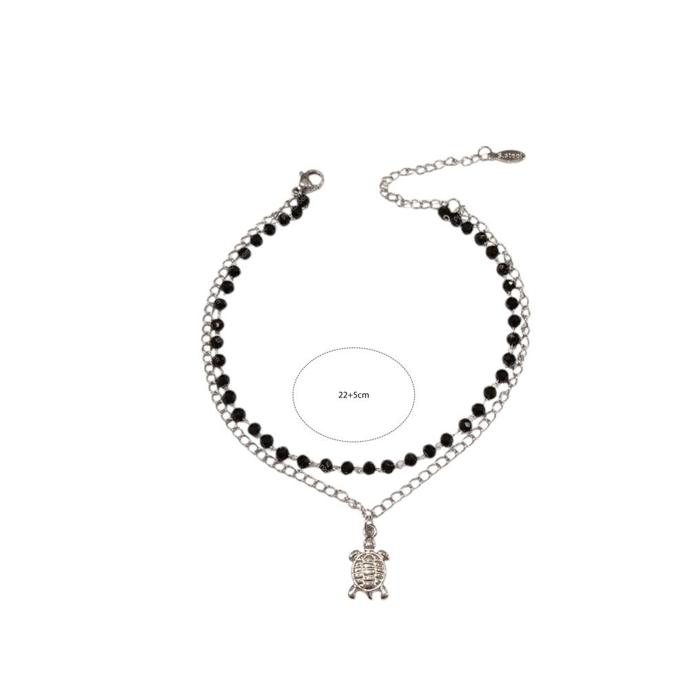 διπλό βραχιόλι ποδιού με συνδυασμό αλυσίδας και μαύρων χαντρών, διακοσμημένο με χαριτωμένο μενταγιόν σε σχήμα χελώνας στο κέντρο. διαθέσιμο σε χρυσό και ασημί χρώμα, με ρυθμιζόμενο κούμπωμα για τέλεια εφαρμογή. playful και καλοκαιρινό, ιδανικό για beach looks ή για όσες αγαπούν τα boho αξεσουάρ.