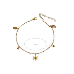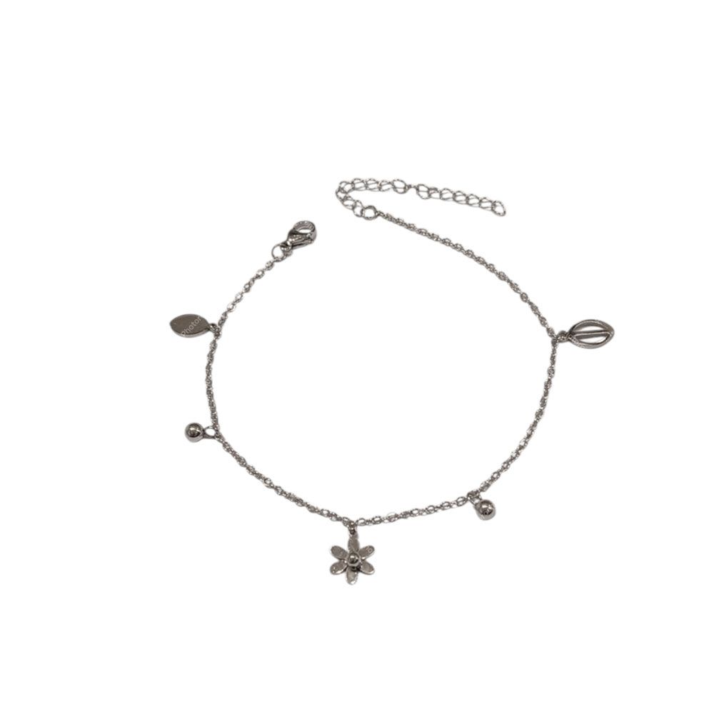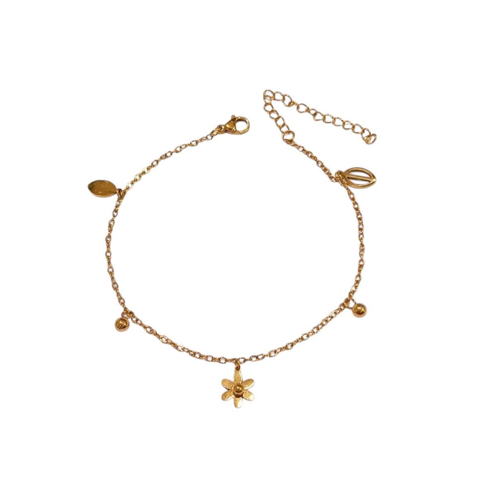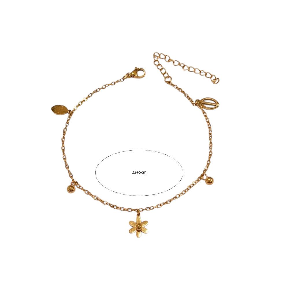 Ανάλαφρο και ρομαντικό, αυτό το βραχιόλι ποδιού στολίζεται με λουλουδάκι στο κέντρο, διακριτικό μεταλλικό φύλλο και μικρές μπίλιες που κινούνται παιχνιδιάρικα με κάθε βήμα. Ιδανικό για τις καλοκαιρινές εμφανίσεις με σανδάλια ή ξυπόλυτο στην παραλία. Διατίθεται σε χρυσό και ασημί, με ρυθμιζόμενο μήκος για τέλεια εφαρμογή σε κάθε αστράγαλο.
