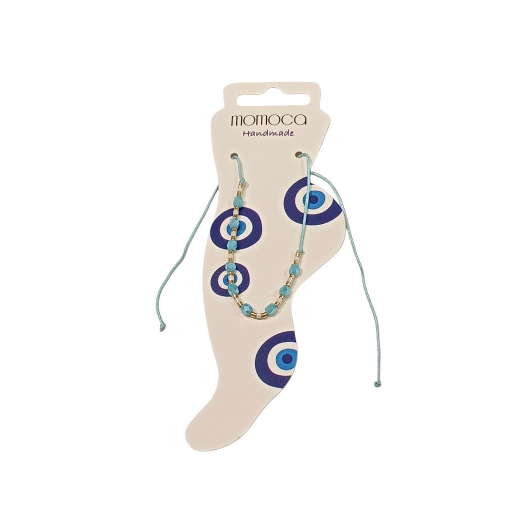 Χειροποίητο βραχιόλι ποδιού με λεπτεπίλεπτες τιρκουάζ και χρυσές χάντρες, περασμένες σε λεπτό κορδόνι σε γαλάζια απόχρωση. Διαθέτει ρυθμιζόμενο κούμπωμα για άψογη εφαρμογή και άνεση. Ένα διακριτικό αλλά κομψό αξεσουάρ, ιδανικό για καλοκαιρινές εμφανίσεις, που προσθέτει boho πινελιές στο look σας. Φοριέται μόνο του ή σε layering με άλλα βραχιόλια ποδιού.
