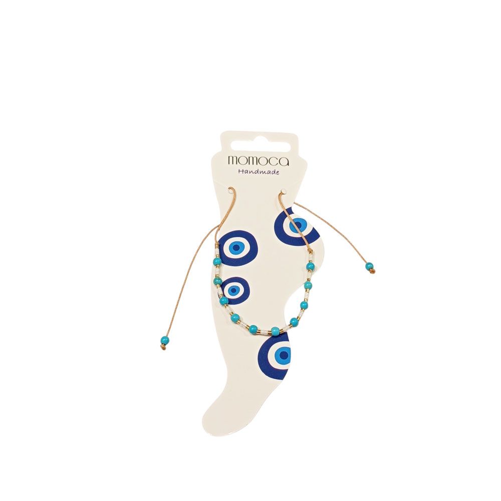 Χειροποίητο βραχιόλι ποδιού με κομψές τιρκουάζ και χρυσές χάντρες, περασμένες σε φυσικό κορδόνι. Διαθέτει ρυθμιζόμενο κλείσιμο για άνετη εφαρμογή και ευελιξία. Ένα καλοκαιρινό, boho-chic αξεσουάρ που αναδεικνύει τη μαυρισμένη επιδερμίδα και ταιριάζει τέλεια με σανδάλια ή ξυπόλυτες εμφανίσεις στην παραλία.