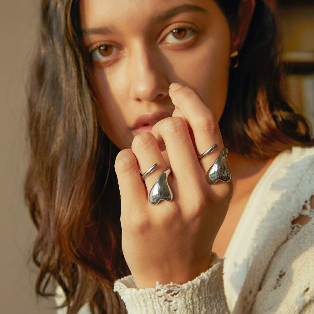 Μοντέρνο δαχτυλίδι από ανοξείδωτο ατσάλι με οργανικό, ρευστό σχεδιασμό που αγκαλιάζει φυσικά το δάχτυλο. Η γυαλιστερή επιφάνειά του δημιουργεί εντυπωσιακές αντανακλάσεις, προσδίδοντας σύγχρονο και καλλιτεχνικό χαρακτήρα στο κόσμημα. Είναι ρυθμιζόμενο, προσφέροντας άνετη εφαρμογή και ευκολία προσαρμογής σε διαφορετικά μεγέθη. Ιδανικό για statement εμφανίσεις αλλά και για minimal σύνολα με μοντέρνα αισθητική.