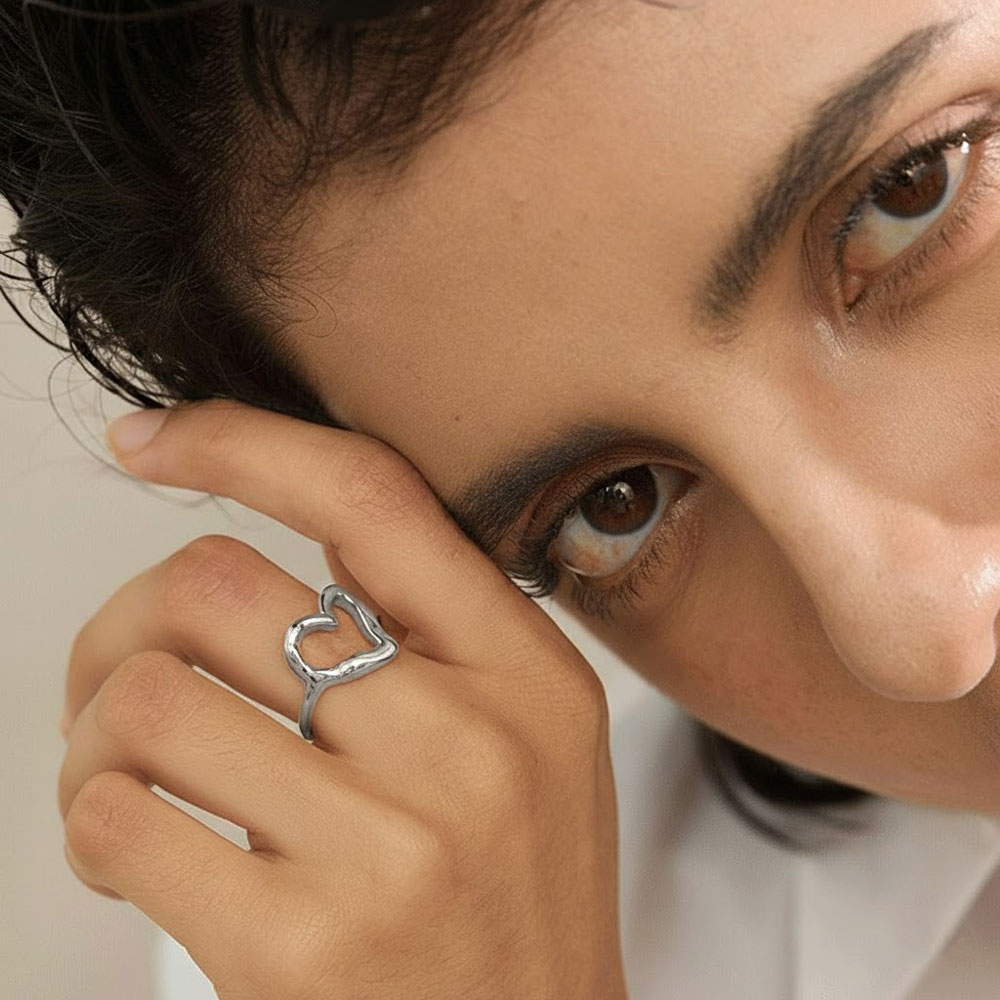 Μοντέρνο δαχτυλίδι από ανοξείδωτο ατσάλι σε ιδιαίτερο σχήμα ακανόνιστης, “ρευστής” καρδιάς που προσδίδει έναν καλλιτεχνικό και σύγχρονο χαρακτήρα. Ο minimal αλλά εντυπωσιακός σχεδιασμός του το καθιστά το ιδανικό statement κομμάτι για κάθε μέρα, ενώ η ανοιχτή, ρυθμιζόμενη βάση του εξασφαλίζει τέλεια εφαρμογή σε κάθε δάχτυλο.