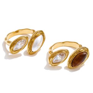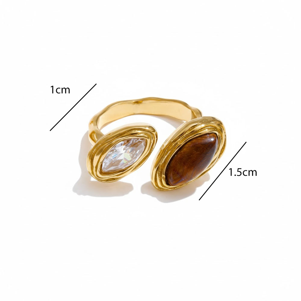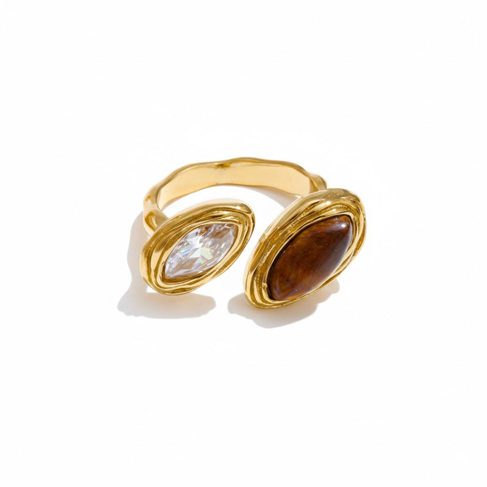 Κομψό δαχτυλίδι από ανοξείδωτο ατσάλι με διπλή οβάλ πέτρα, μία καφέ τύπου tiger eye και μία διαφανή κρυστάλλινη, που χαρίζει ιδιαίτερο και μοντέρνο χαρακτήρα στο στυλ σας. Διαθέτει προσαρμοζόμενο μέγεθος για άνετη εφαρμογή και είναι ιδανικό για καθημερινή χρήση αλλά και πιο ιδιαίτερες εμφανίσεις, προσφέροντας ανθεκτικότητα και διαχρονική κομψότητα.