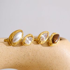 Κομψό και μοντέρνο δαχτυλίδι από ανοξείδωτο ατσάλι σε χρυσή απόχρωση, με διπλή οβάλ πέτρα που συνδυάζει λαμπερό κρύσταλλο και φίνα λευκή πέρλα, δημιουργώντας ένα εντυπωσιακό αλλά διακριτικό αποτέλεσμα. Ο ανοιχτός σχεδιασμός του επιτρέπει την εύκολη προσαρμογή μεγέθους, ώστε να εφαρμόζει άνετα σε κάθε δάχτυλο, ενώ η ανθεκτική κατασκευή του το καθιστά ιδανικό για καθημερινή χρήση αλλά και για ιδιαίτερες εμφανίσεις, προσθέτοντας μια πινελιά διαχρονικής κομψότητας και θηλυκότητας.