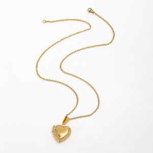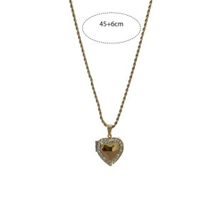 Εντυπωσιακό ατσάλινο κολιέ με μενταγιόν σε σχήμα καρδιάς που ανοίγει, ιδανικό για να φυλάξετε μέσα του μια μικρή φωτογραφία ή ένα αγαπημένο φυλαχτό. Η καρδιά διαθέτει λαμπερή επιφάνεια και διακόσμηση με λευκά στρας περιμετρικά, ενώ η χρυσή αλυσίδα προσφέρει κομψότητα και διαχρονικό στυλ. Κατασκευασμένο από ανοξείδωτο ατσάλι, ανθεκτικό και υποαλλεργικό.