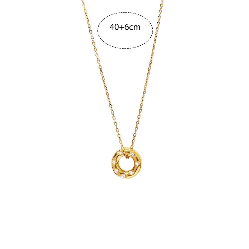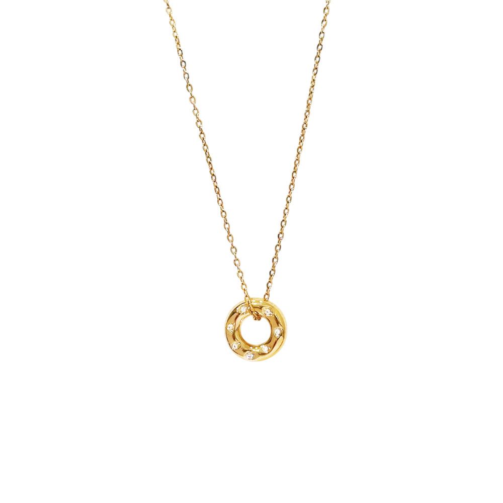 Μοντέρνο ατσάλινο κολιέ με χρυσό μενταγιόν σε σχήμα κρίκου, διακοσμημένο με λαμπερά ζιργκόν που προσθέτουν διακριτική λάμψη και κομψότητα. Ένα minimal αλλά εντυπωσιακό σχέδιο που ταιριάζει εύκολα σε κάθε στυλ και περίσταση. Κατασκευασμένο από ανοξείδωτο ατσάλι, δεν μαυρίζει και παραμένει αναλλοίωτο στον χρόνο. Χαρακτηριστικά: Υλικό: Ανοξείδωτο ατσάλι Σχέδιο: Κρίκος με ζιργκόν Χρώμα: Χρυσό Ρυθμιζόμενο μήκος (40 + 6 cm) Ιδανικό για καθημερινό και βραδινό look