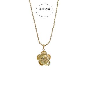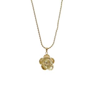 Κομψό ατσάλινο κολιέ με μενταγιόν σε σχήμα λουλουδιού, ιδανικό για να προσθέσει λάμψη και θηλυκότητα σε κάθε σας εμφάνιση. Το χρυσό φινίρισμα και οι διακριτικές πέτρες στο κέντρο του λουλουδιού χαρίζουν πολυτελή αισθητική και κομψότητα. Κατασκευασμένο από ανοξείδωτο ατσάλι, ανθεκτικό και υποαλλεργικό, ιδανικό για καθημερινή χρήση αλλά και πιο ιδιαίτερες περιστάσεις.