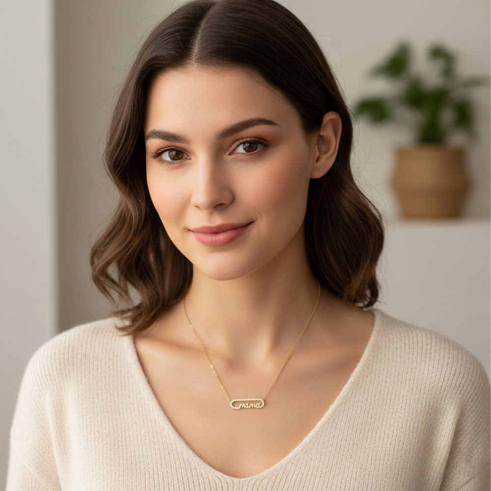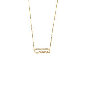 Κομψό κολιέ από ατσάλι σε χρυσή απόχρωση, διακοσμημένο με λαμπερά ζιργκόν και την λέξη “mama” σε λεπτεπίλεπτο σχέδιο. Με μήκος 40+6 cm, φοριέται άνετα και αποτελεί ένα τρυφερό, διαχρονικό δώρο για κάθε μαμά.