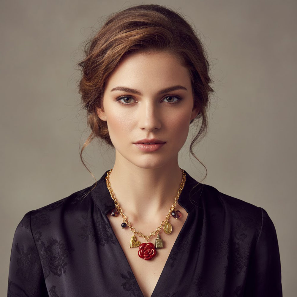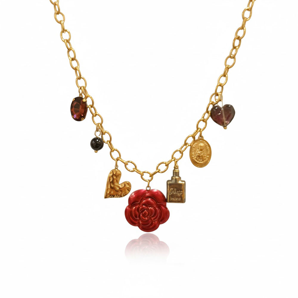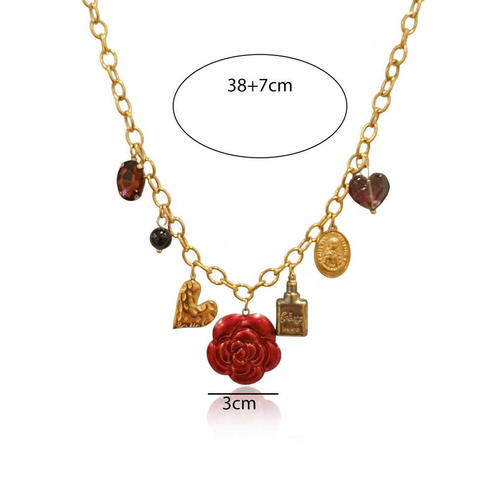 Εντυπωσιακό κολιέ από ανοξείδωτο ατσάλι με μοναδικό κόκκινο τριαντάφυλλο και διακοσμητικά charms σε χρυσή απόχρωση. Ένα statement κομμάτι που συνδυάζει ρομαντική αισθητική και μοντέρνα λάμψη, ιδανικό για κομψές εμφανίσεις που ξεχωρίζουν με στιλ.