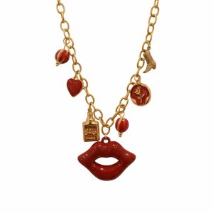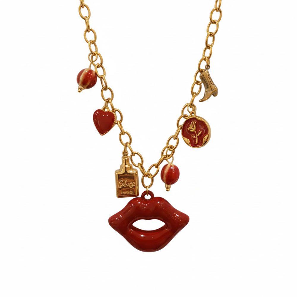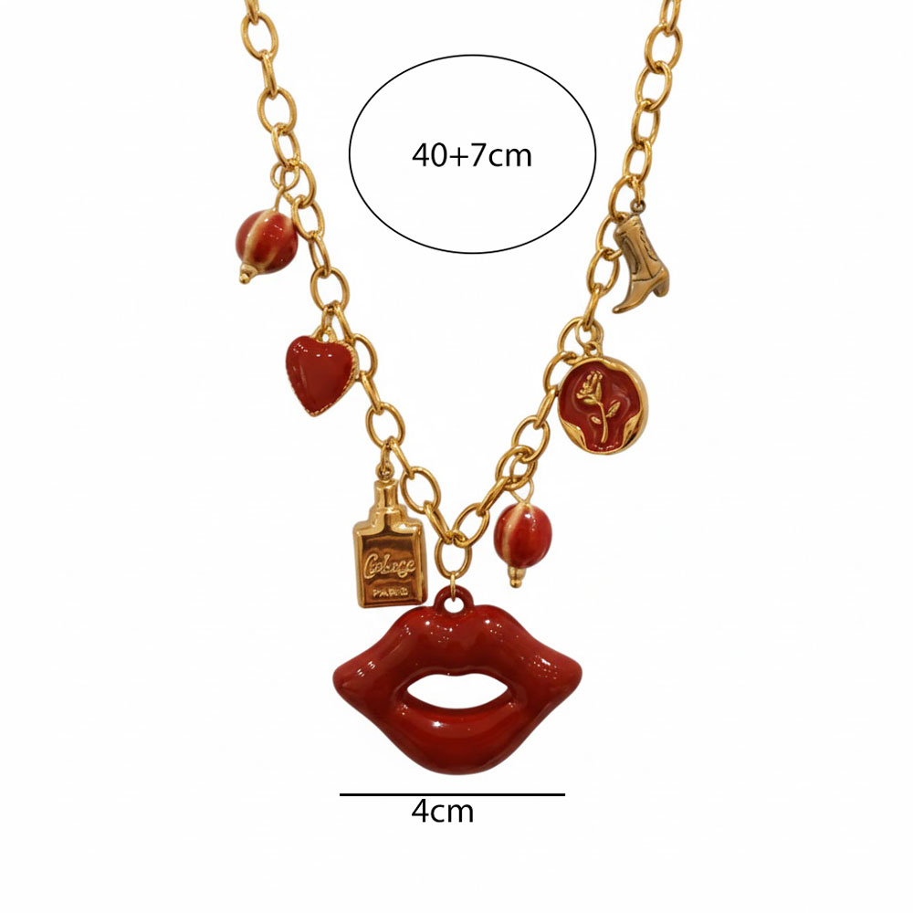 Statement κολιέ από ανοξείδωτο ατσάλι, διακοσμημένο με ποικιλία κρεμαστών μοτίφ και εντυπωσιακό charm σε σχήμα χειλιών. Ένα playful και μοντέρνο σχέδιο που δίνει ξεχωριστό χαρακτήρα σε κάθε εμφάνιση, ιδανικό για όσες αγαπούν αξεσουάρ με προσωπικότητα και στιλ.