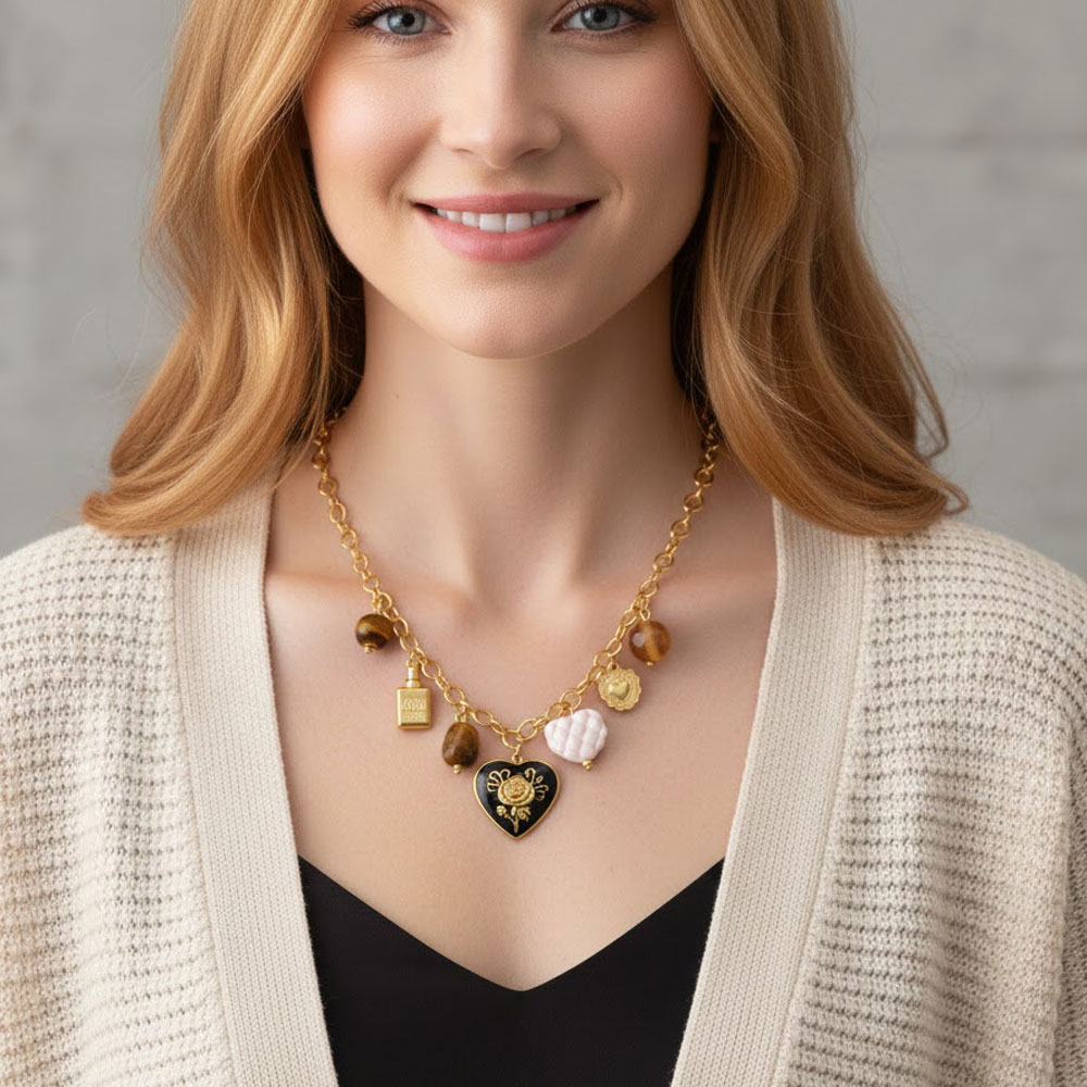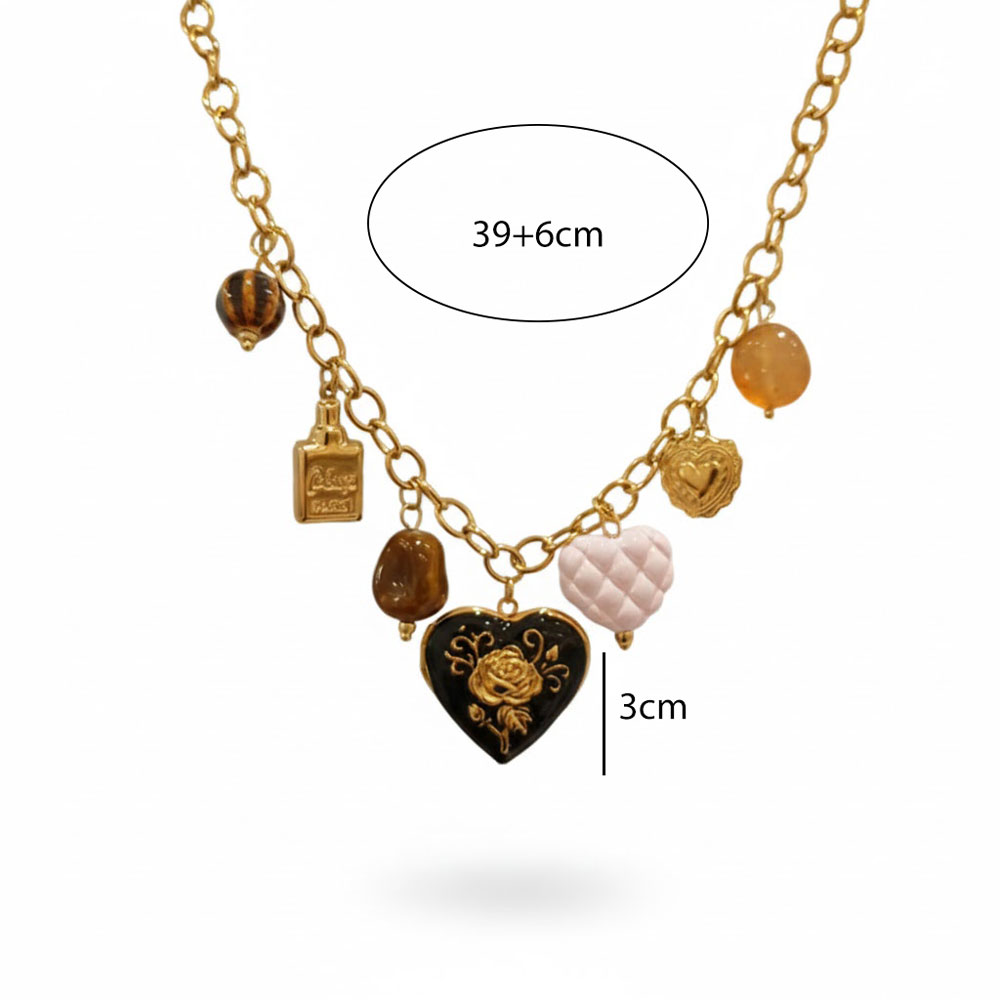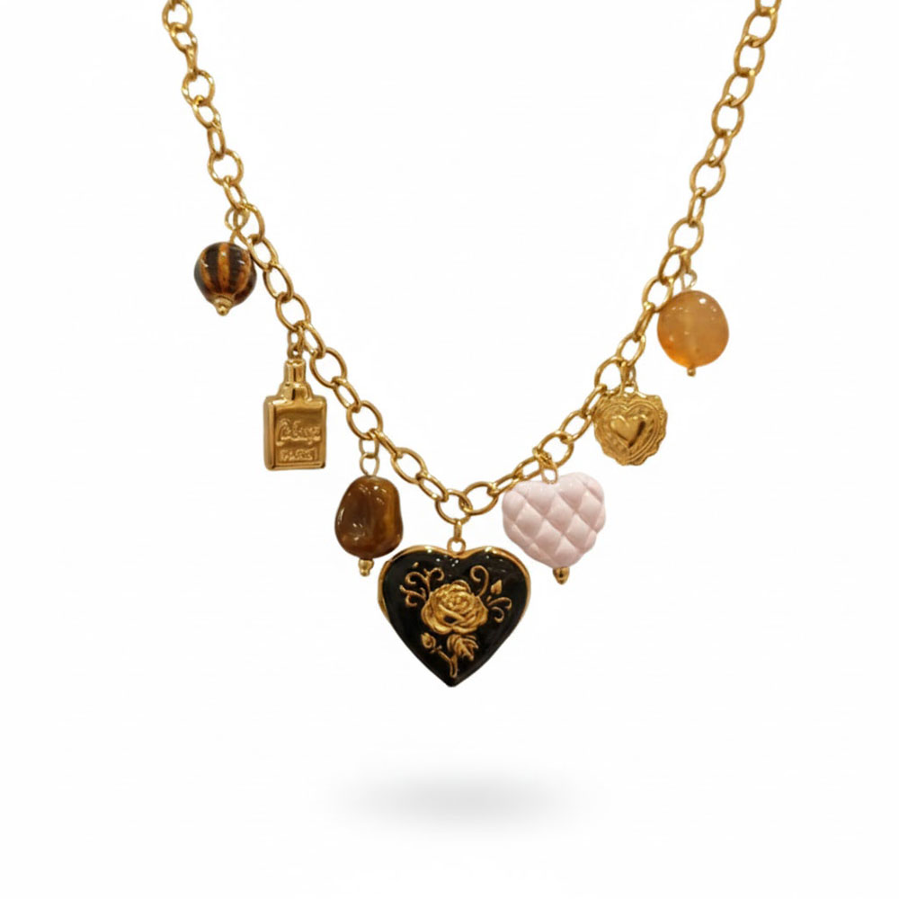 Κολιέ από ανοξείδωτο ατσάλι με ιδιαίτερα κρεμαστά στοιχεία και κεντρικό μοτίφ καρδιάς, διακοσμημένο με ανάγλυφες λεπτομέρειες που προσθέτουν κομψότητα και χαρακτήρα. Ένα μοναδικό σχέδιο που ολοκληρώνει κάθε εμφάνιση με μοντέρνο, elegant ύφος.