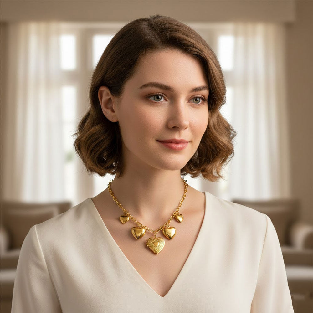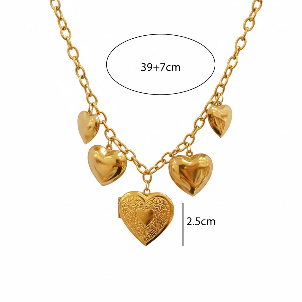 Κολιέ από ανοξείδωτο ατσάλι με κρεμαστές καρδιές και κεντρικό μοτίφ-καρδιά που ανοίγει, προσφέροντας μια ρομαντική και ιδιαίτερη λεπτομέρεια. Ένα εντυπωσιακό και θηλυκό σχέδιο που χαρίζει κομψότητα και χαρακτήρα σε κάθε εμφάνιση.