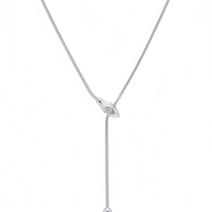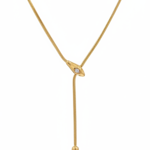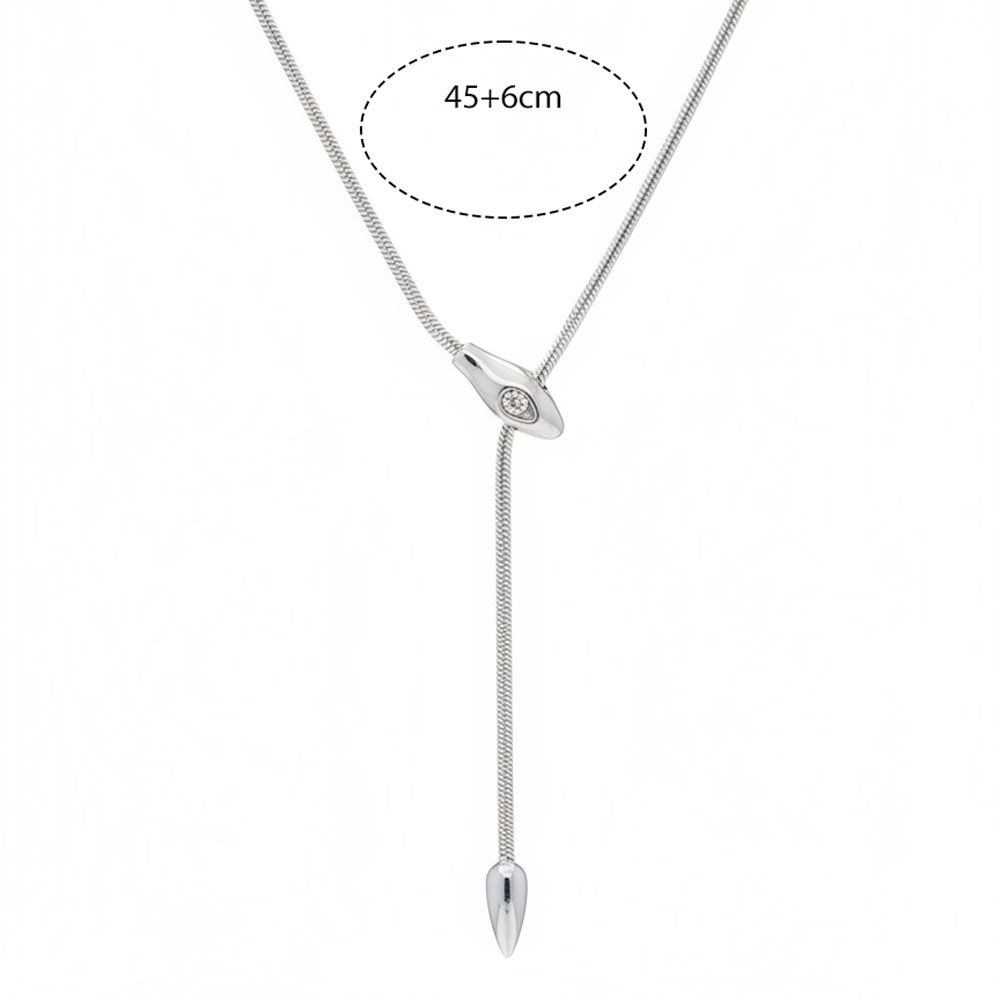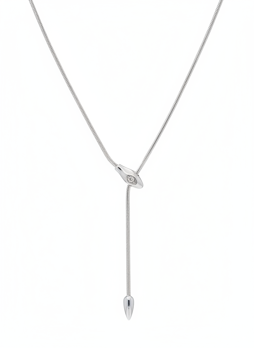 Ατσάλινο κολιέ τύπου lariat με μοτίφ φίδι, όπου το κεφάλι αναδεικνύεται με λαμπερό ζιργκόν. Η αλυσίδα καταλήγει σε κρεμαστό στοιχείο δάκρυ, δίνοντας στο σχέδιο κίνηση και ένταση. Ένα κομψό και μοντέρνο κόσμημα που συνδυάζει μυστήριο και στυλ, ιδανικό για καθημερινές αλλά και βραδινές εμφανίσεις. Μήκος αλυσίδας 45+6cm για άνετη εφαρμογή.