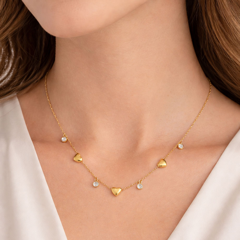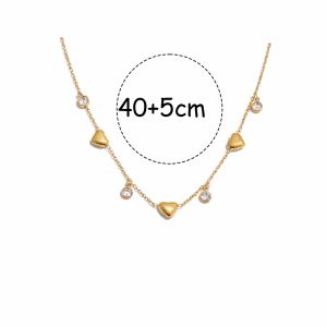 Κομψή και διαχρονική ατσάλινη κολιέ σε χρυσο χρώμα, διακοσμημένη με καρδιές και λαμπερά ζιργκόν που χαρίζουν διακριτική λάμψη σε κάθε εμφάνιση. Κατασκευασμένη από ανοξείδωτο ατσάλι υψηλής ποιότητας, δεν μαυρίζει και είναι ιδανική για καθημερινή χρήση αλλά και για πιο ιδιαίτερες περιστάσεις. Φοριέται άνετα μόνη της ή σε layering με άλλα κολιέ, προσθέτοντας μία ρομαντική και μοντέρνα πινελιά στο στυλ σας. Εξαιρετική επιλογή και για δώρο. Χαρακτηριστικά: Υλικό: Ανοξείδωτο Ατσάλι Χρώμα: Χρυσο Πέτρες: Ζιργκόν Σχέδιο: Καρδιές Ανθεκτική στο νερό και στη φθορά Δεν προκαλεί αλλεργίες